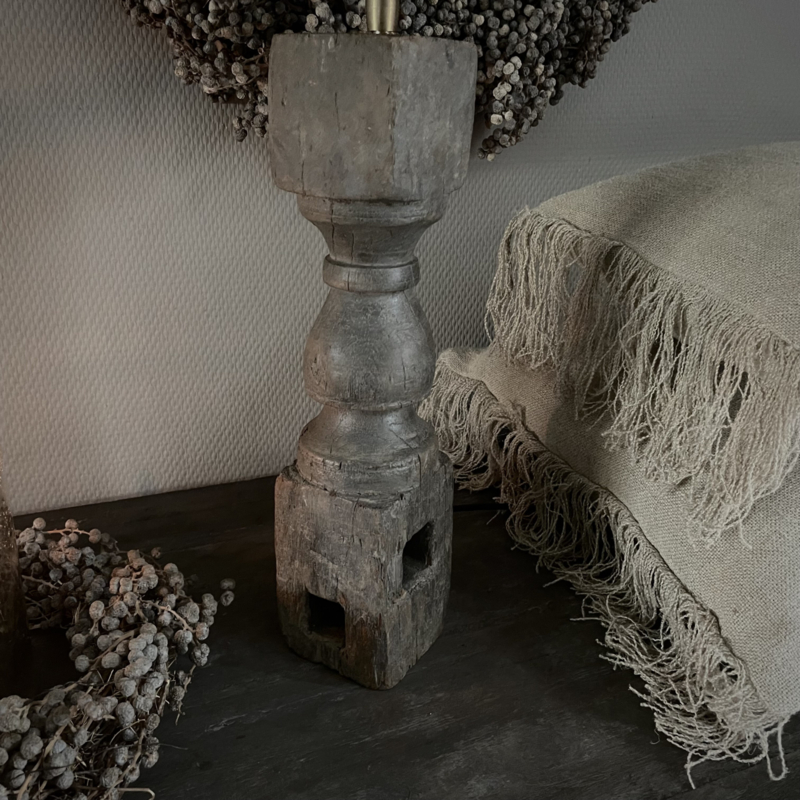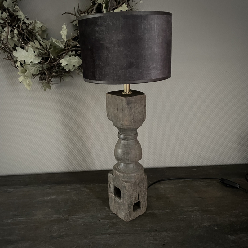 Mooie authentieke houten balusterlamp in prachtig vergrijsde houtkleur, deze unieke lamp wordt geleverd met cilinderkap in de kleur antraciet 'velvet', deze heeft een diameter van 20 cm. De totale hoogte van de lamp (dus met kap) is 51 cm. Voet 8 x 8 cm.