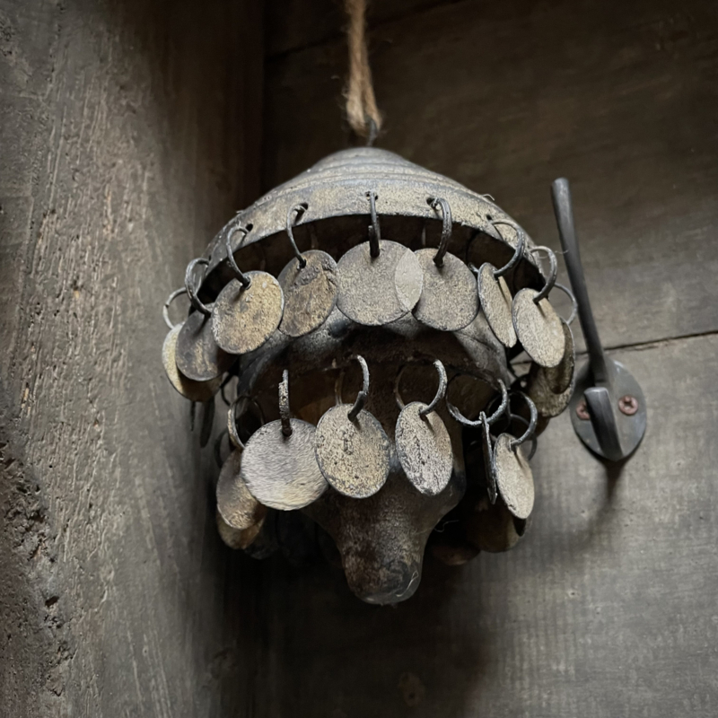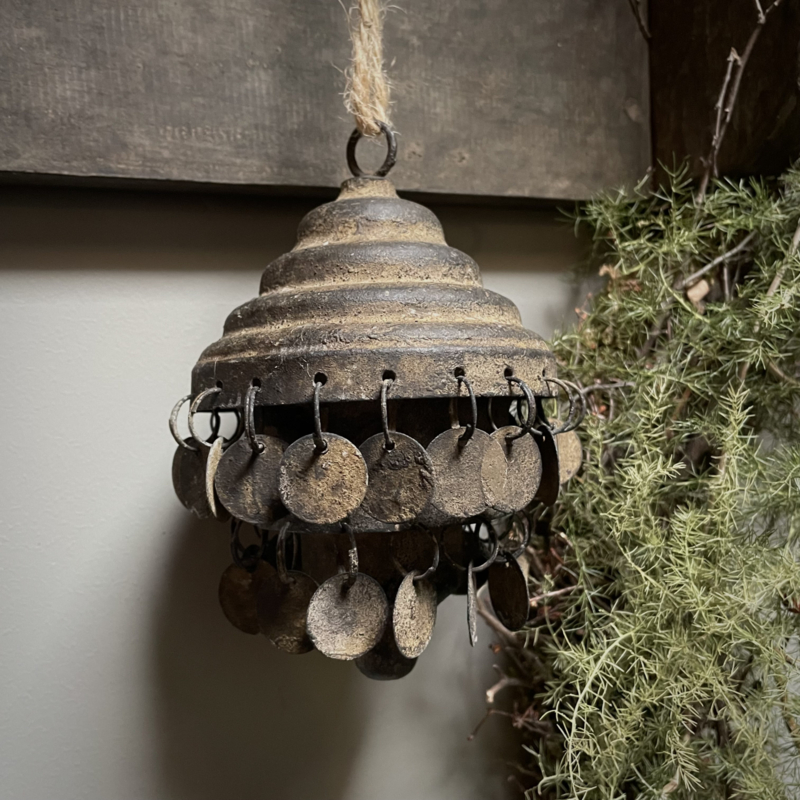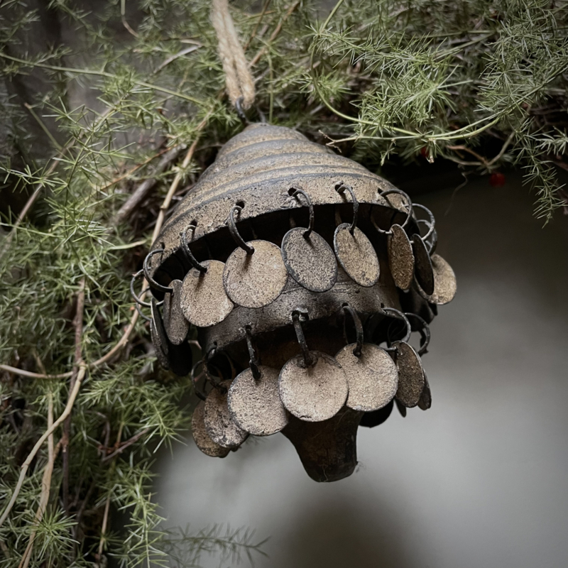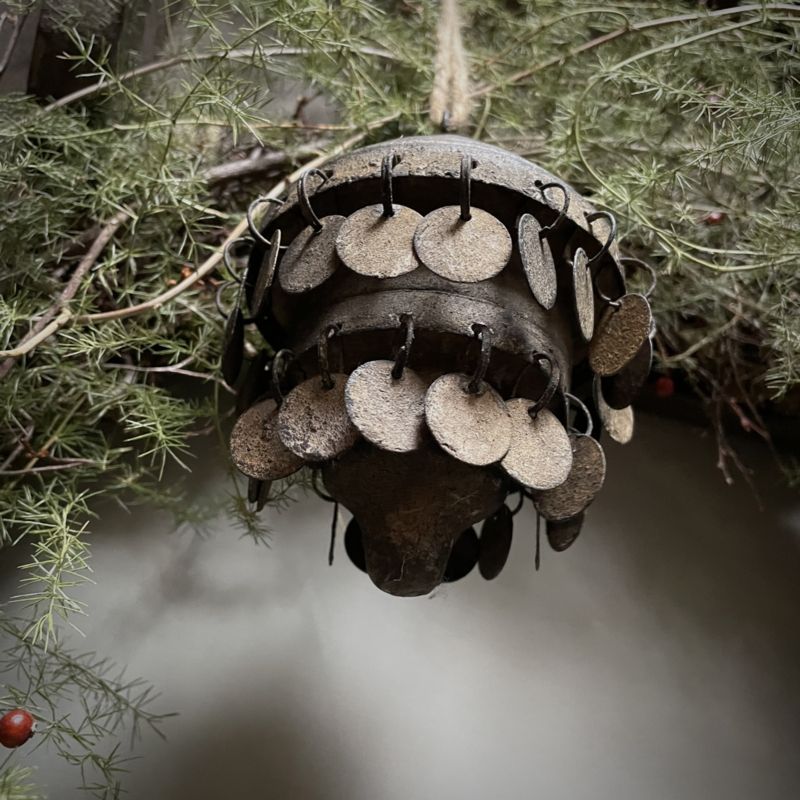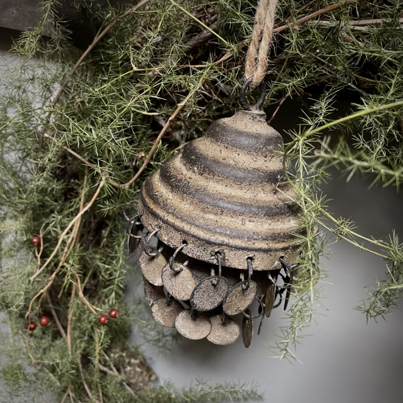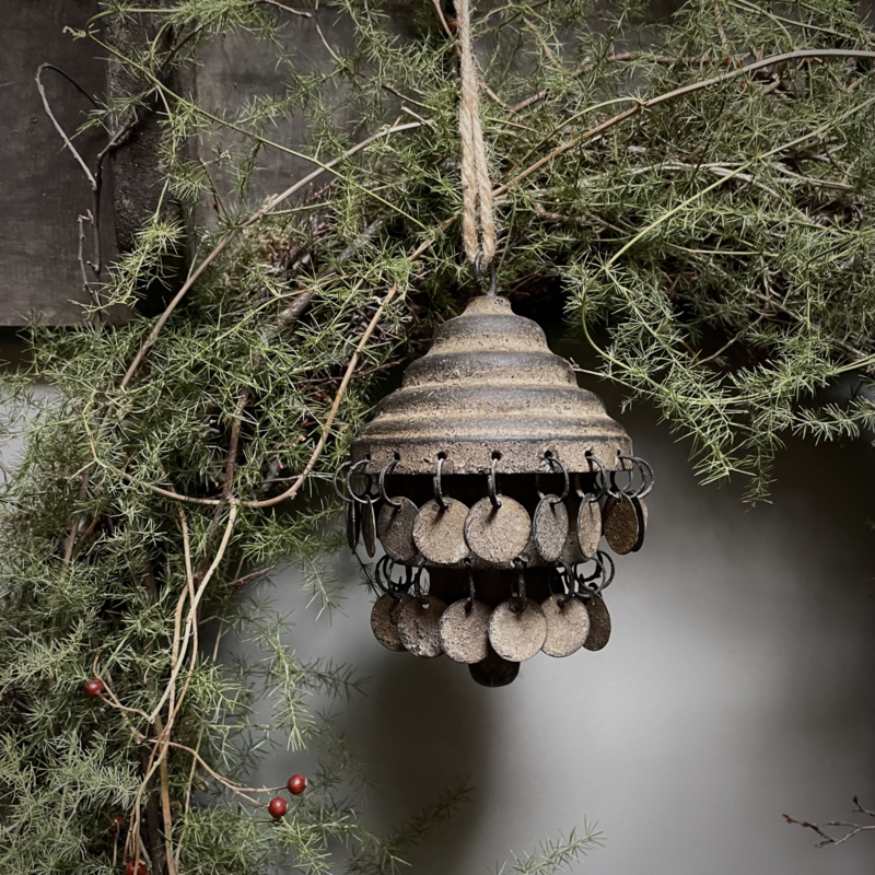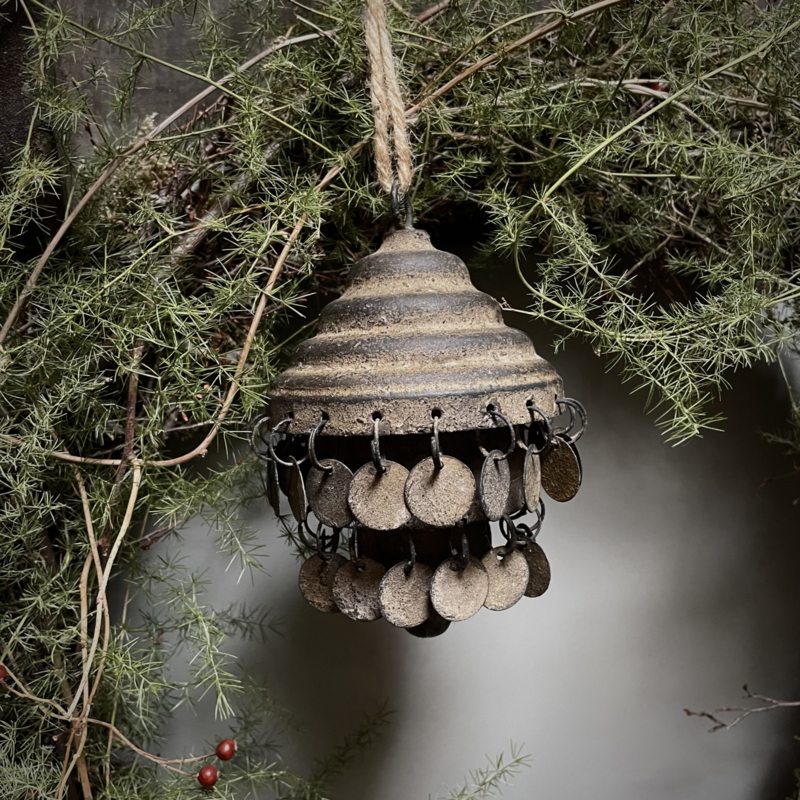 Sobere klos van metaal met dubbele rij muntjes in roestig patina. Prachtig aan een tak, in een toef, schaal of in de kerstboom. De hoogte is 15,5 cm. (exclusief touw gemeten) De diameter is 11,5 cm.