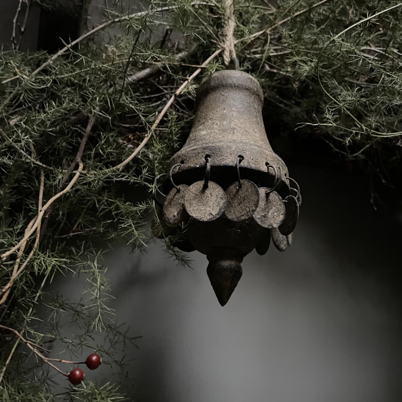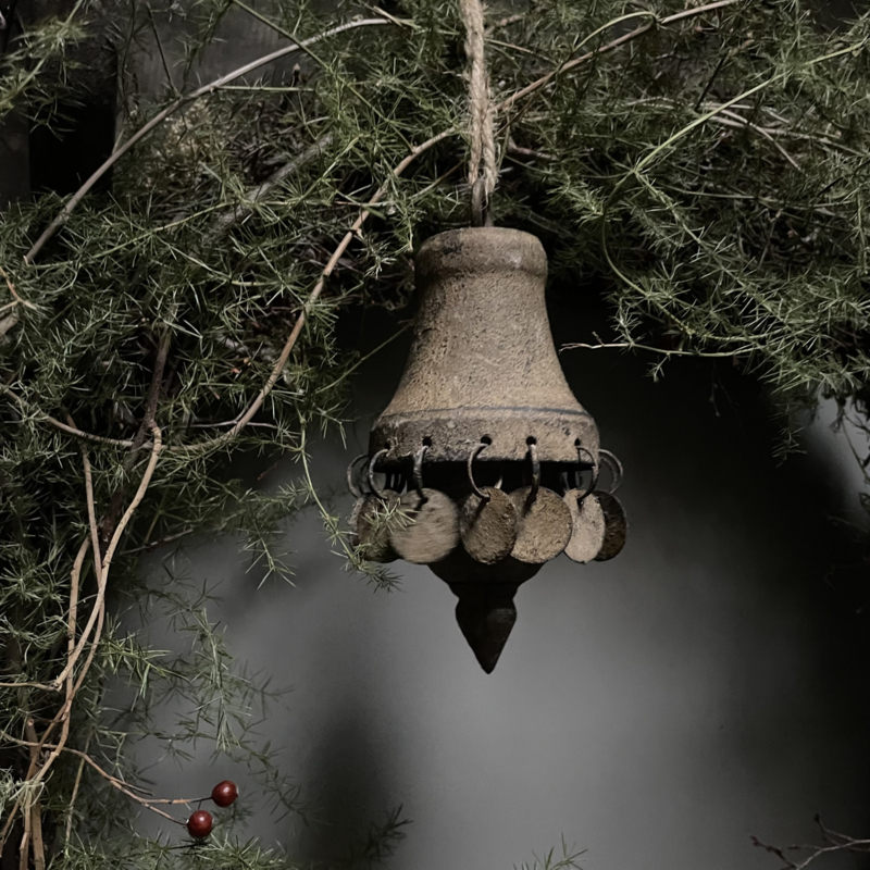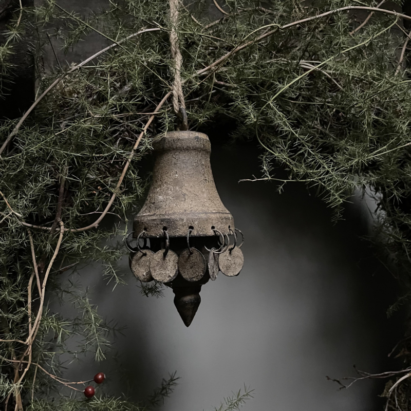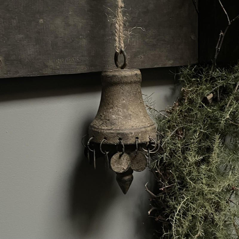 Sobere klos van metaal in roestig patina. Prachtig aan een tak, in een toef, schaal of in de kerstboom. De hoogte is 15 cm. (exclusief touw gemeten) De diameter is 7,5 cm.