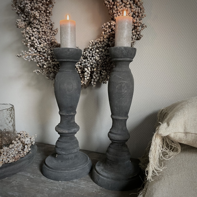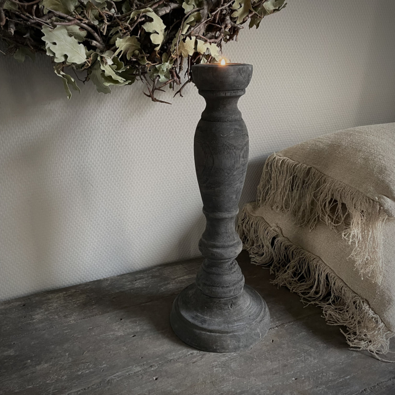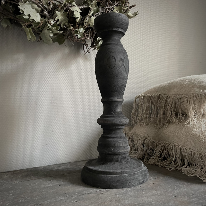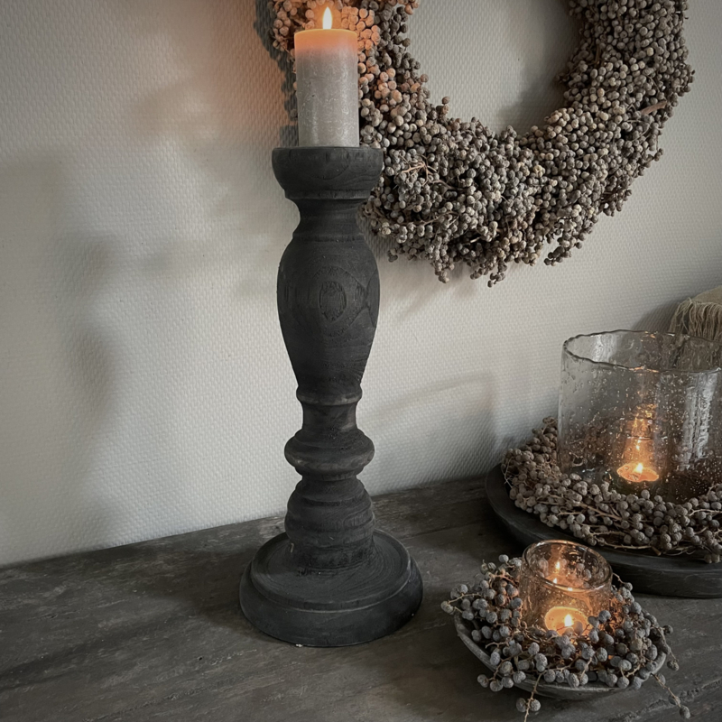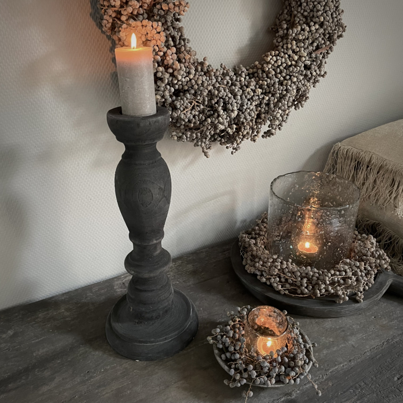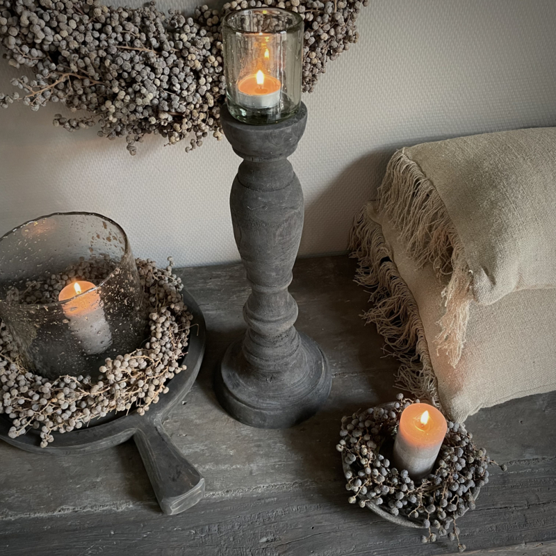 Zware massief houten kandelaar in donkere finish, de hoogte is 40 cm, de diameter boven is 9 cm, onderkant voet is 17 cm. Leuk met een theelichtje, een stompkaars of leg er wat mos of tillandsia op met een bubbelwindlichtje. (op de foto's is het bubbel windlichtje van € 5,75 gebruikt.