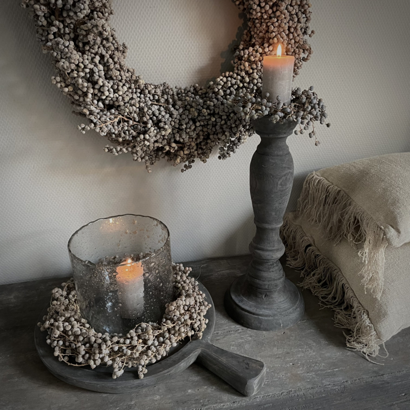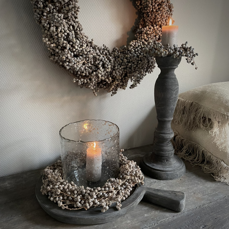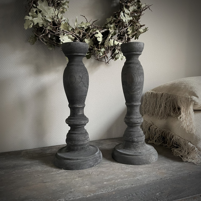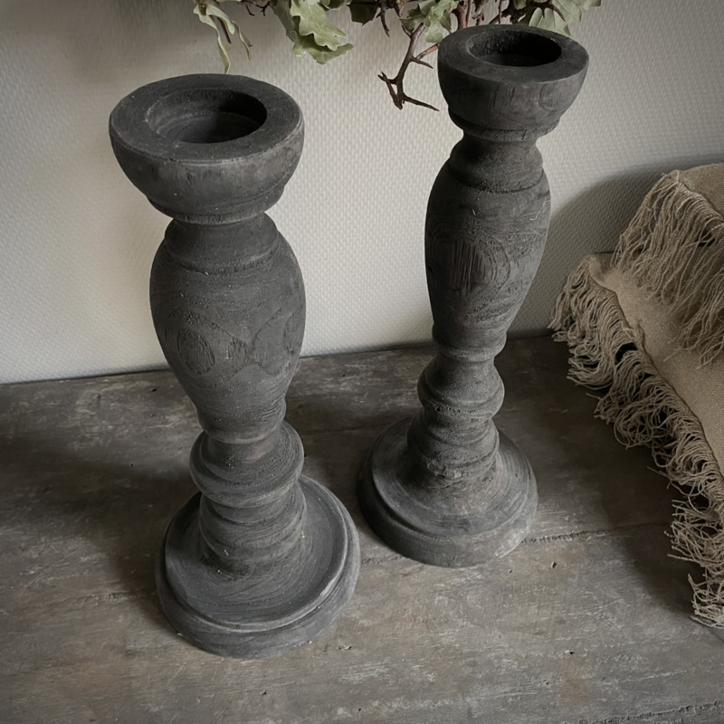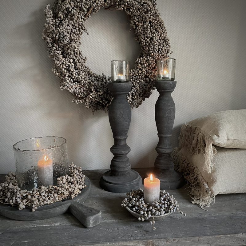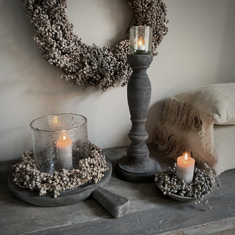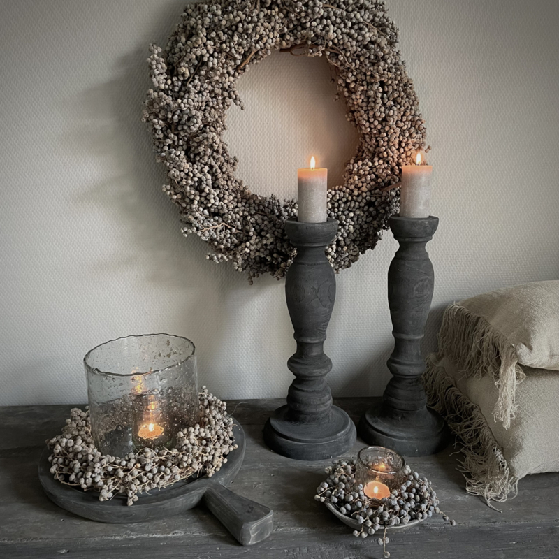 Zware massief houten kandelaar in donkere finish, de hoogte is 40 cm, de diameter boven is 9 cm, onderkant voet is 17 cm. Leuk met een theelichtje, een stompkaars of leg er wat mos of tillandsia op met een bubbelwindlichtje. (op de foto's is het bubbel windlichtje van € 5,75 gebruikt.