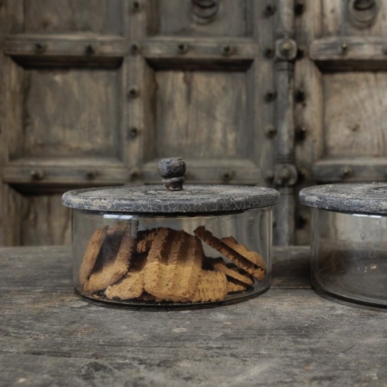 Glazen koektrommel glas met deksel in de kleur vintage. Prachtig om je koeken sfeervol te presenteren, mooi op het aanrecht, eettafel of dressoir. De hoogte is 15 cm, de diameter is 21 cm.