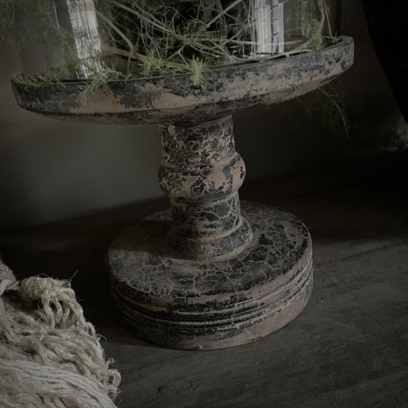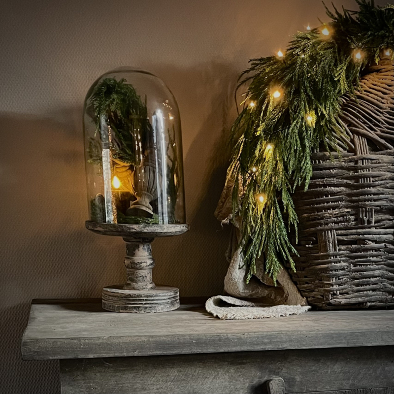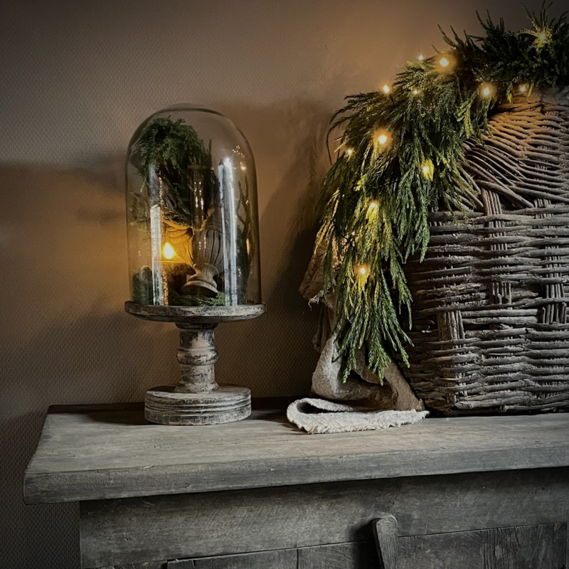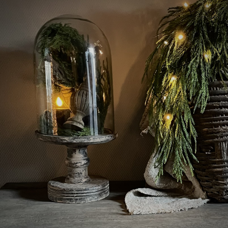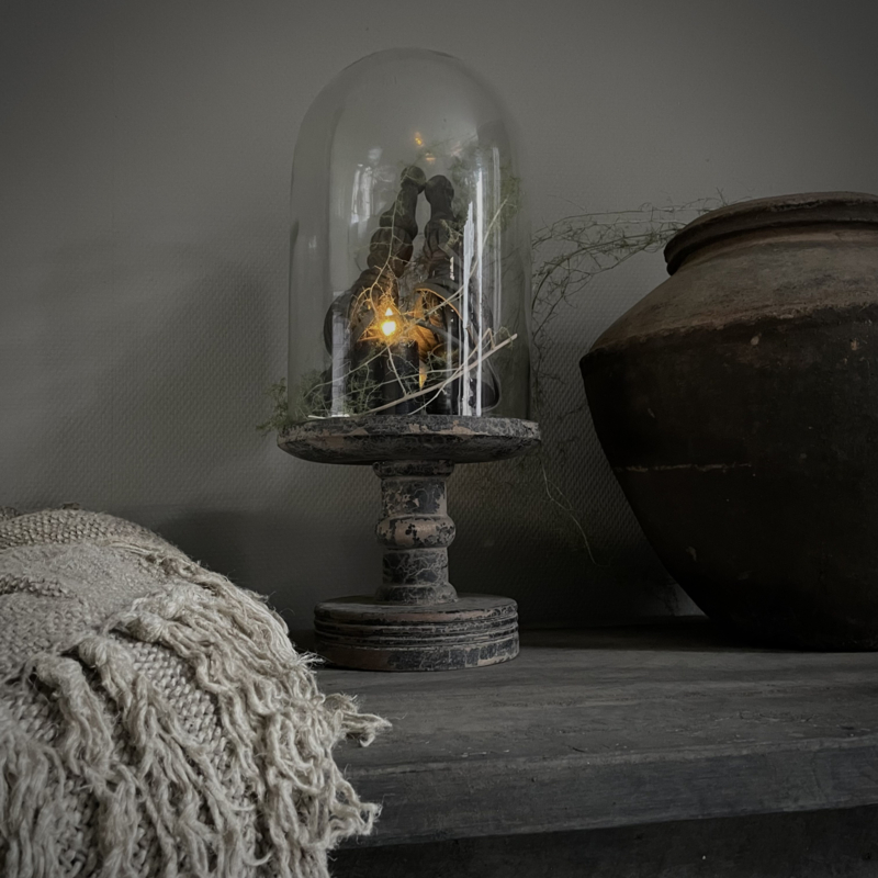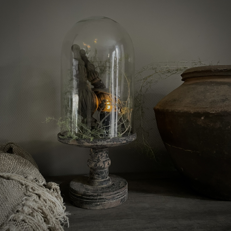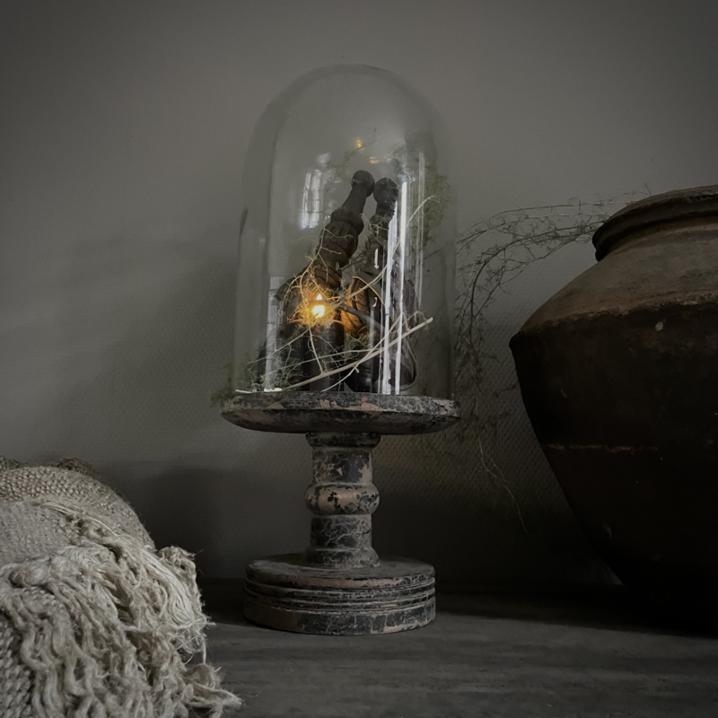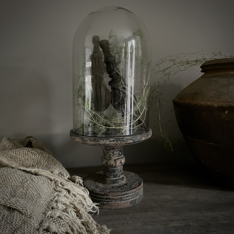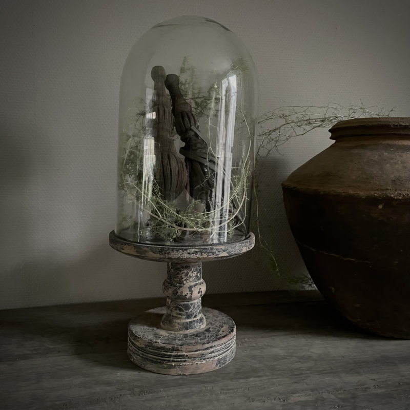 Prachtige stolp in de kleur vintage, de glazen stolp is mondgeblazen, kleine imperfecties dragen bij aan de vintage look. De zware houten voet heeft een mooie doorleefde uitstraling. De hoogte is 51 cm, de diameter is 23 cm. Mooi om te decoreren met kunst takken, ledkaarsjes of andere favoriete vondsten, perfect als blikvanger op een tafel, dressoir of open kast.Een tijdloos en sfeervol item.