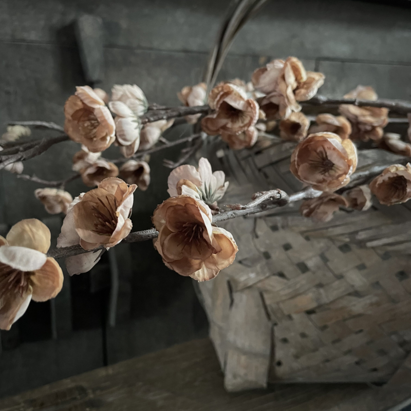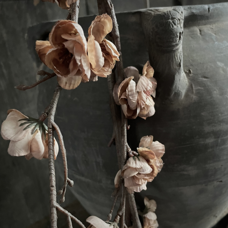 Pachtige zijden bloesemtak uitgevoerd in een zachte, matte cappuchino kleur. De totale lengte is ruim 120 cm. Een prachtige voorjaarstak voor jarenlang plezier. Leuk in een houten kruik of pot, ook mooi in een schaal, of aan een trap met een stuk linnen.