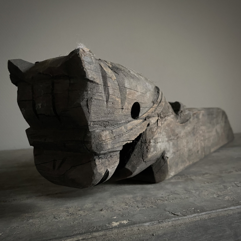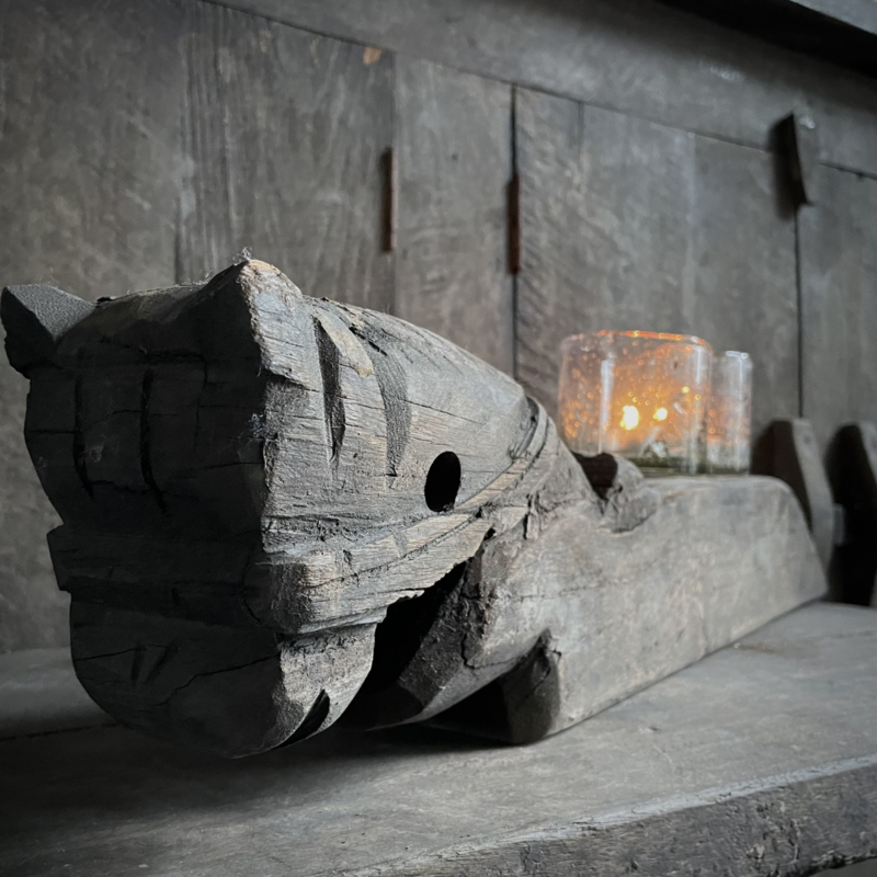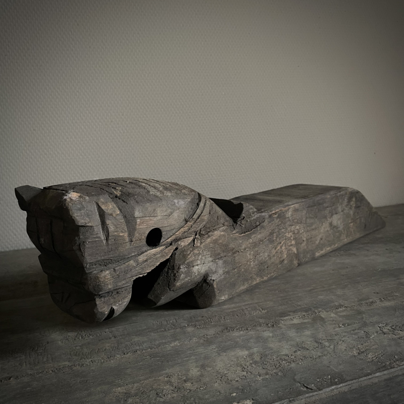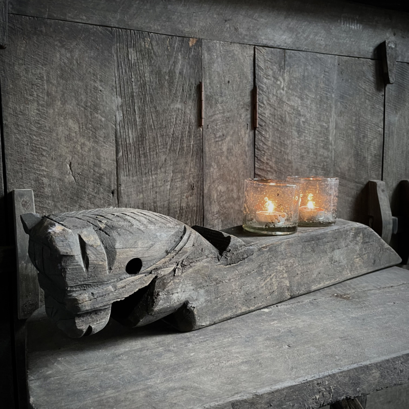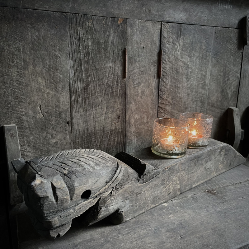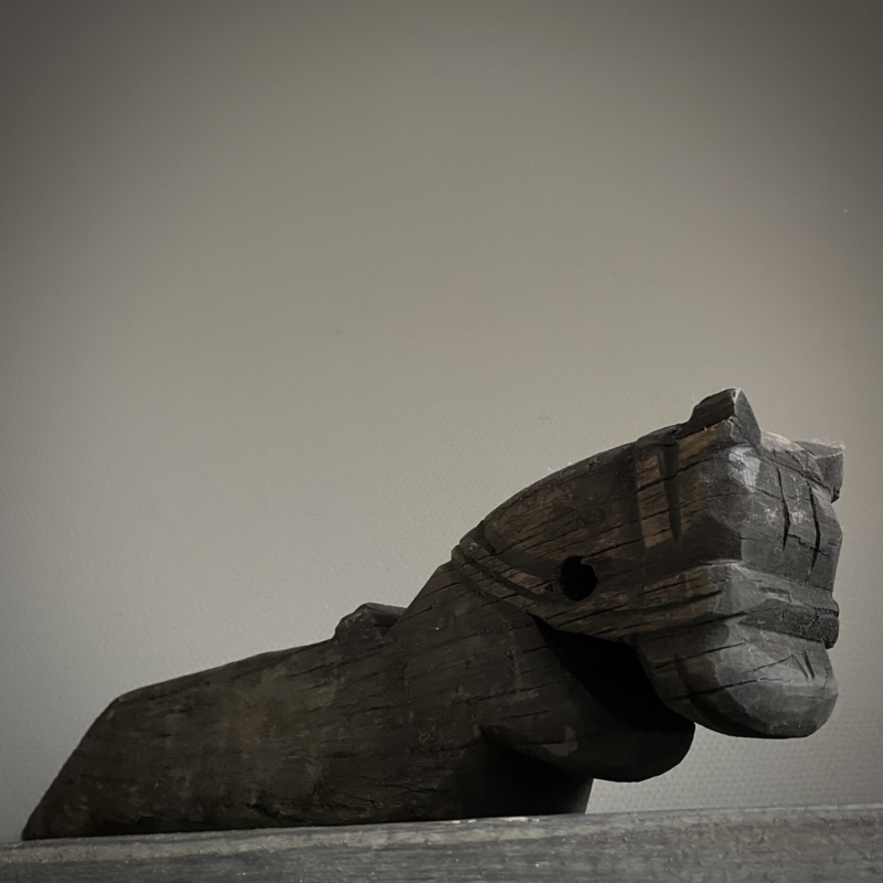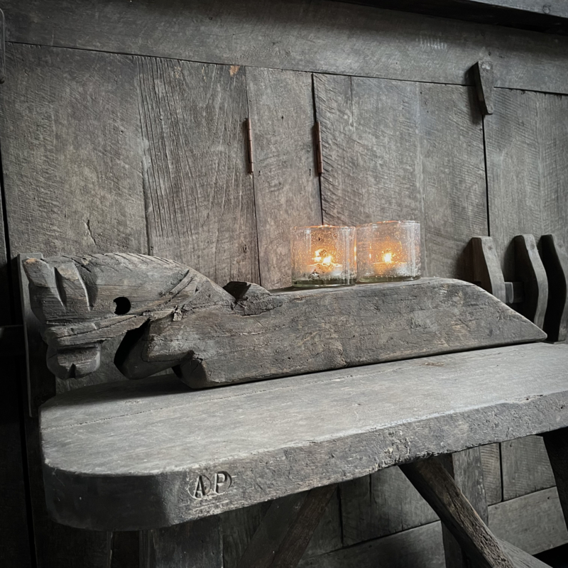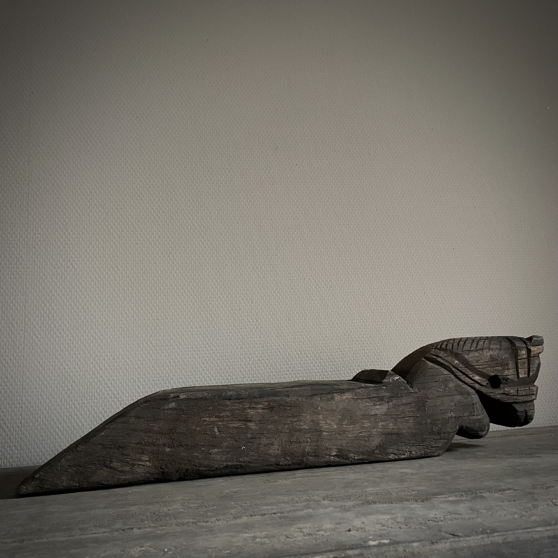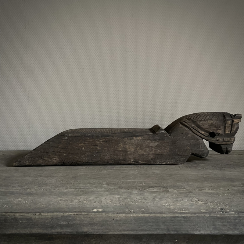 Authentiek houten paard van de Aura Peeperkorn collectie, met prachtige details in mooie vergrijsde kleur. De lengte is 62 cm, de hoogte 14,5 cm en de diepte is 9,5 cm
