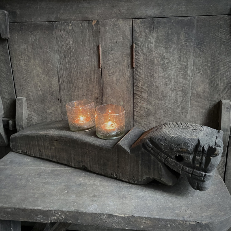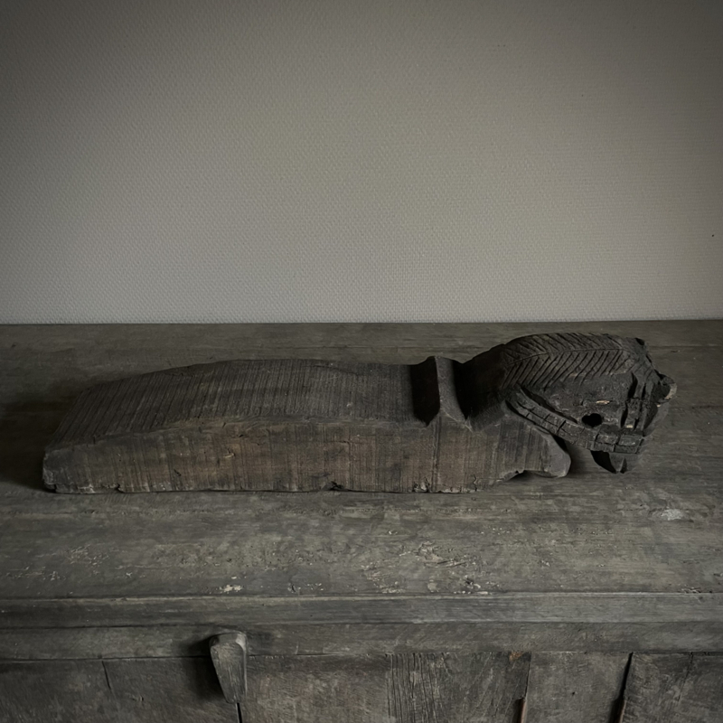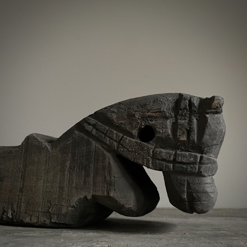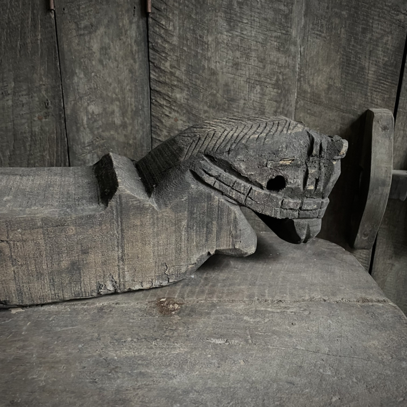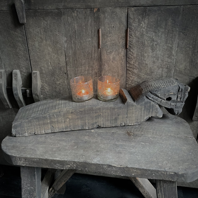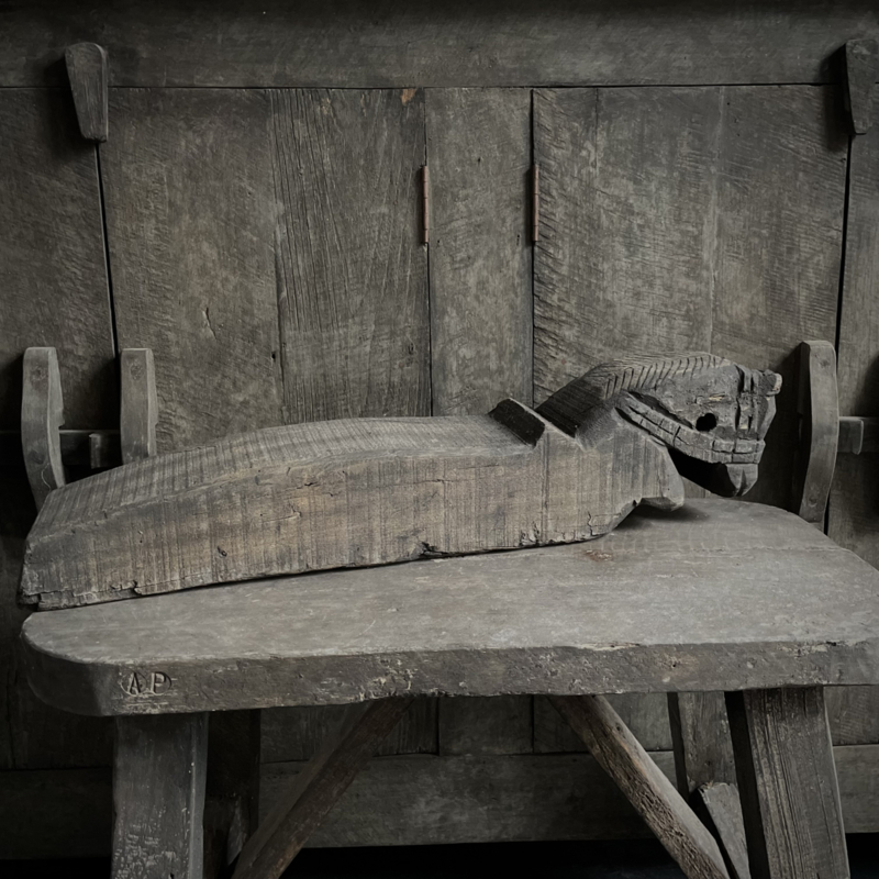 Authentiek houten paard van de Aura Peeperkorn collectie, met prachtige details in mooie vergrijsde kleur. De lengte is 60 cm, de hoogte 14,5 cm en de diepte is 11,5 cm