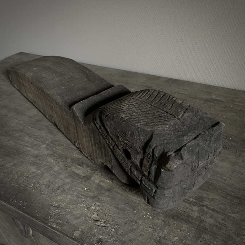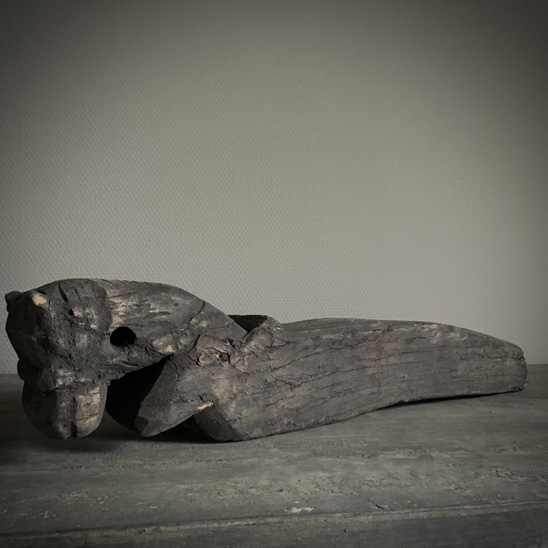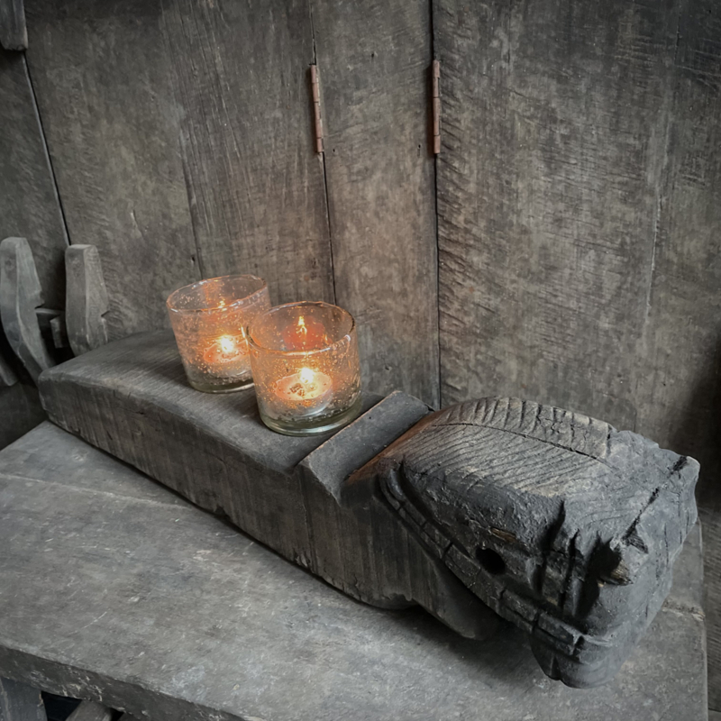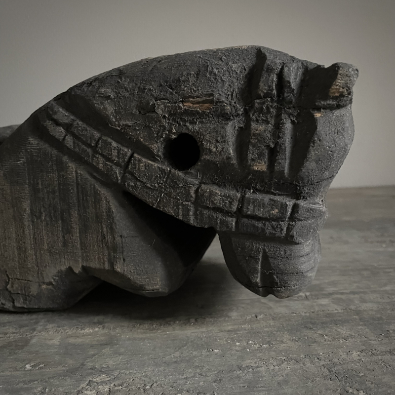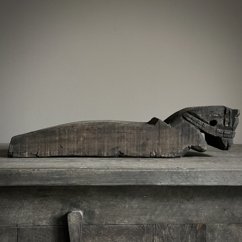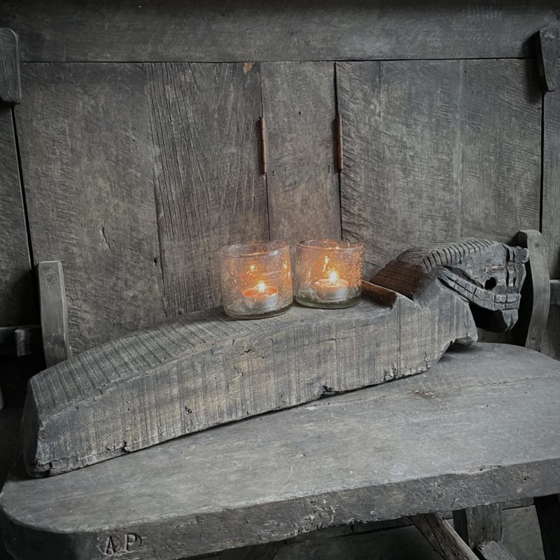 Authentiek houten paard van de Aura Peeperkorn collectie, met prachtige details in mooie vergrijsde kleur. De lengte is 60 cm, de hoogte 14,5 cm en de diepte is 11,5 cm