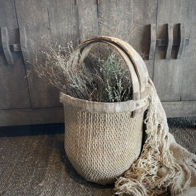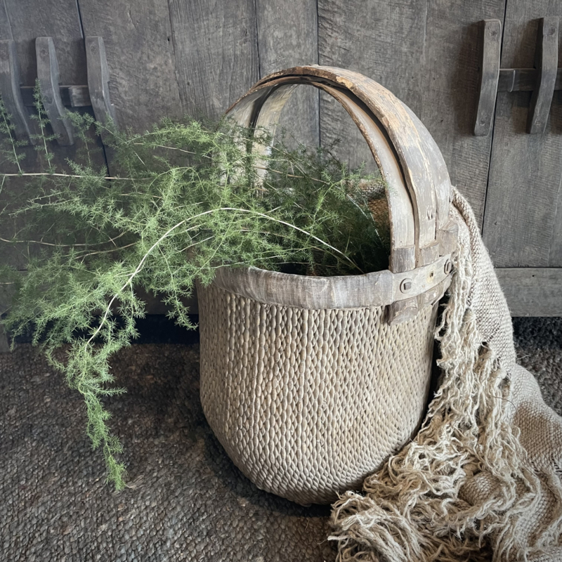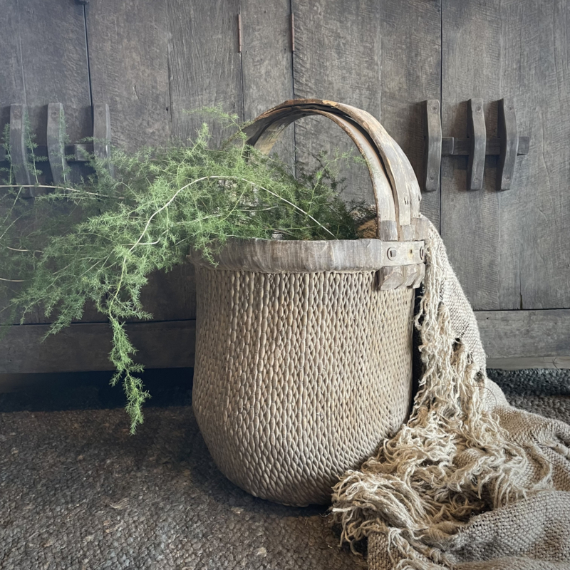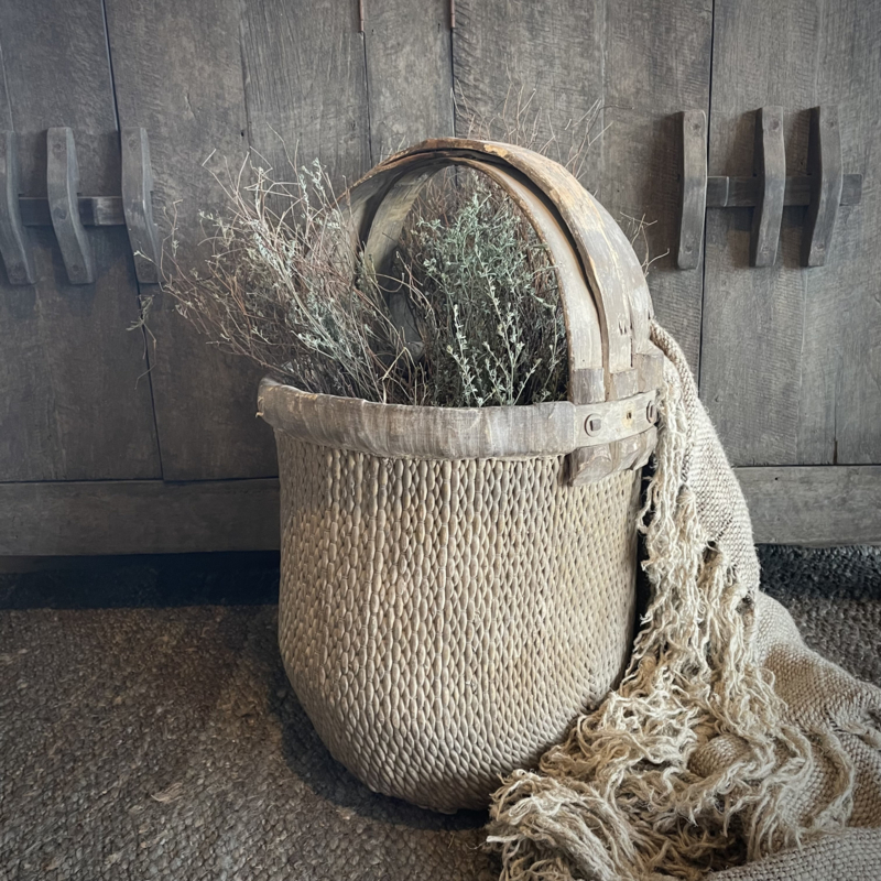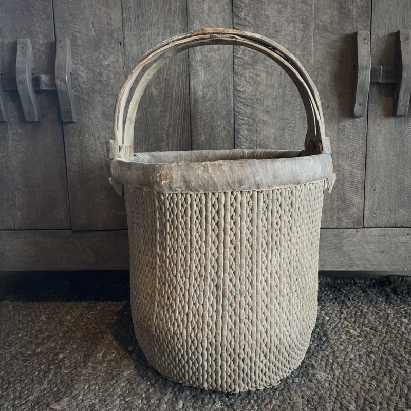 Prachtige oude originele mand, afkomstig uit China. In perfecte staat! In mooie matte kleurstelling. Deze manden worden veelal gebruikt op de velden om thee te plukken. De diameter is 39 cm en de hoogte is 63 cm. Merk Luksa.
