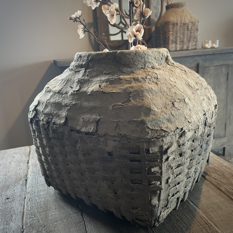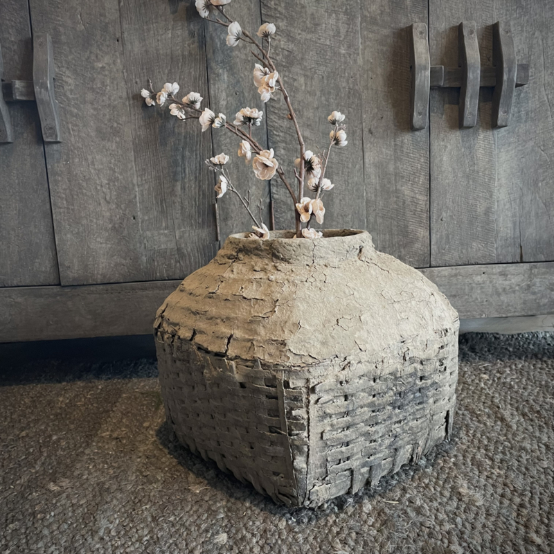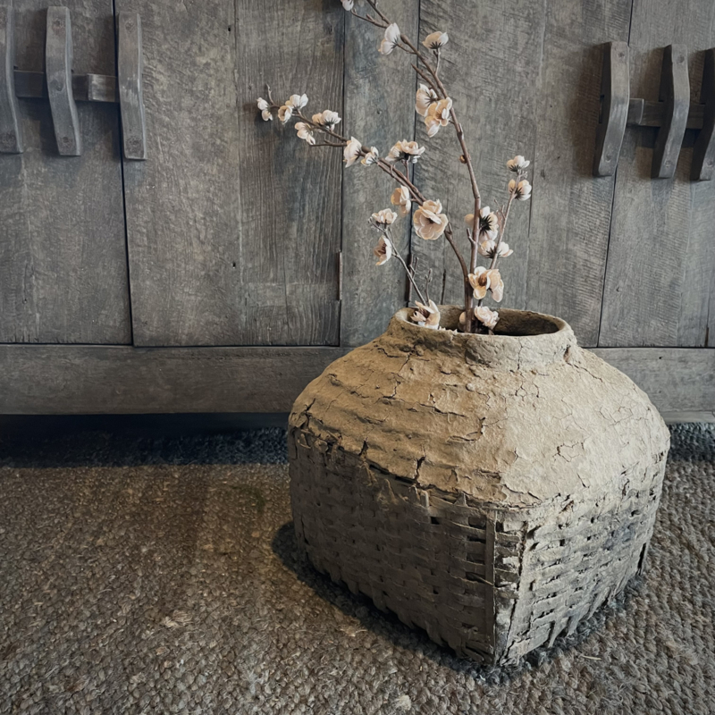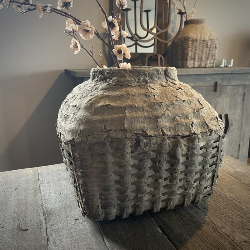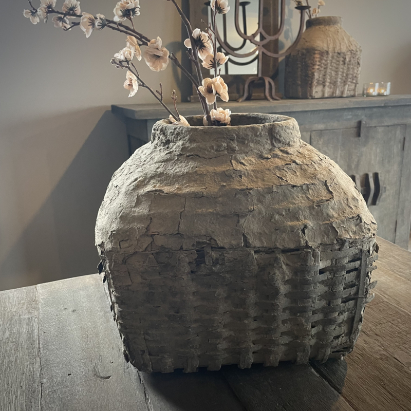 Deze originele vis leemmand is afkomstig uit China, een traditioneel object dat werd gebruikt door vissers langs rivieren en rijstvelden. Deze vismanden zijn doorgaans gevlochten van natuurlijke materialen zoals bamboe, riet of wilgentenen. De mand draagt sporen van ambachtelijk vakmanschap: onregelmatige vlechtpatronen, natuurlijke kleurvariaties en lichte slijtage die getuigt van echt gebruik, dit maakt elke vismand uniek. Oorspronkelijk werd hij met een touw of band gedragen. De hoogte is 33 cm, de breedte is 36 cm, en de diepte is ook 36 cm. Mooi vierkant model!