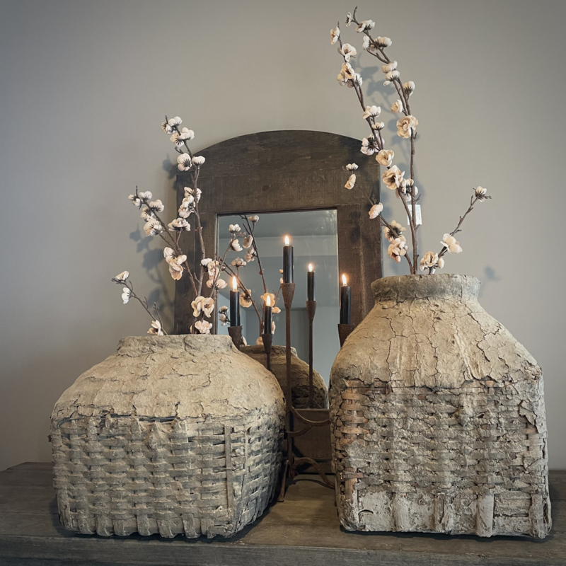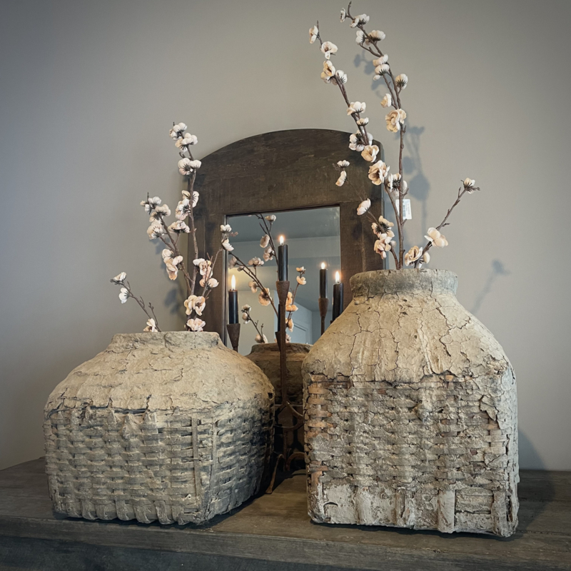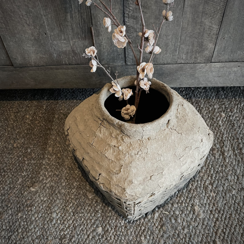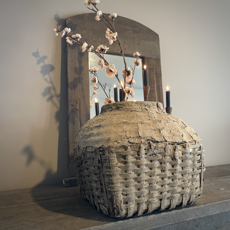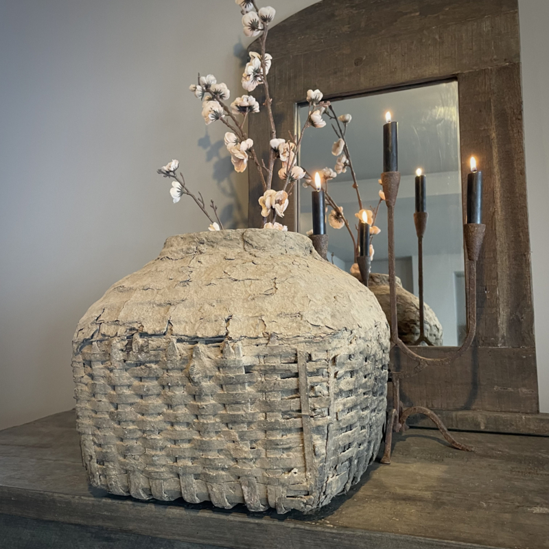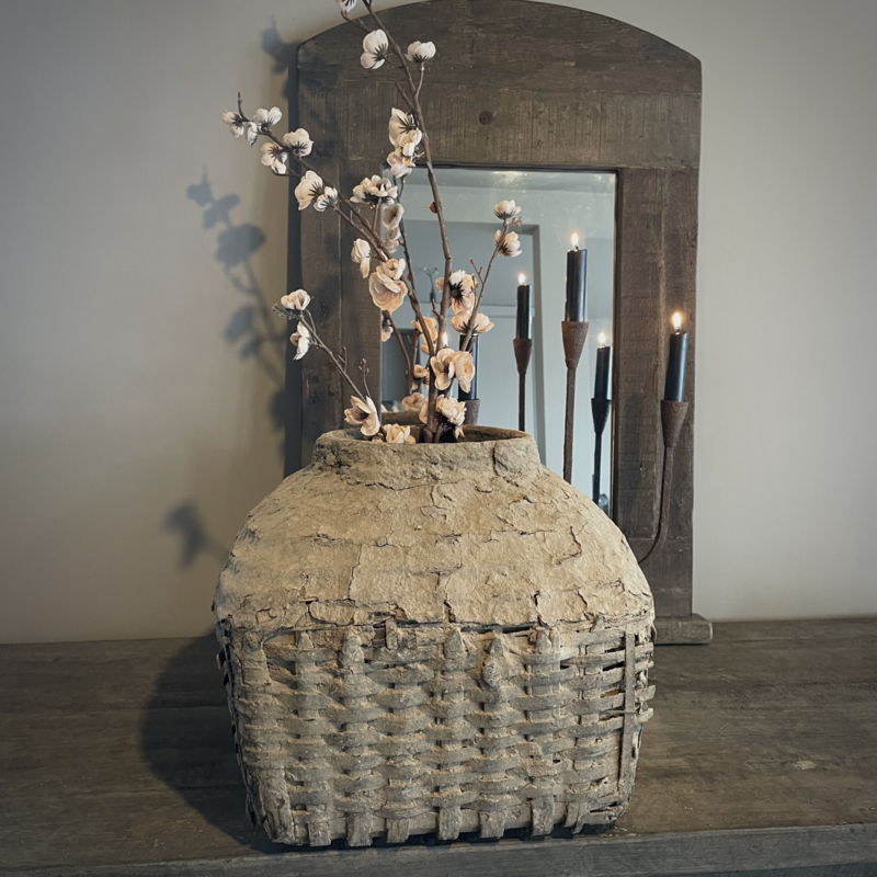 Deze originele vis leemmand is afkomstig uit China, een traditioneel object dat werd gebruikt door vissers langs rivieren en rijstvelden. Deze vismanden zijn doorgaans gevlochten van natuurlijke materialen zoals bamboe, riet of wilgentenen. De mand draagt sporen van ambachtelijk vakmanschap: onregelmatige vlechtpatronen, natuurlijke kleurvariaties en lichte slijtage die getuigt van echt gebruik, dit maakt elke vismand uniek. Oorspronkelijk werd hij met een touw of band gedragen. De hoogte is 33 cm, de breedte is 36 cm, en de diepte is ook 36 cm. Mooi vierkant model!