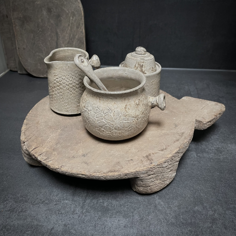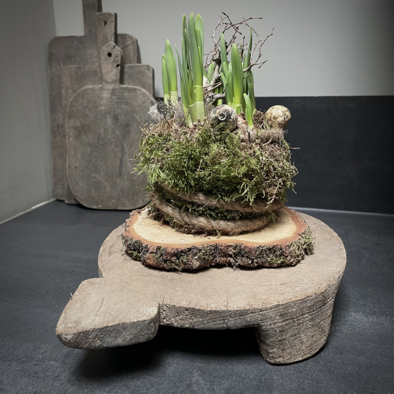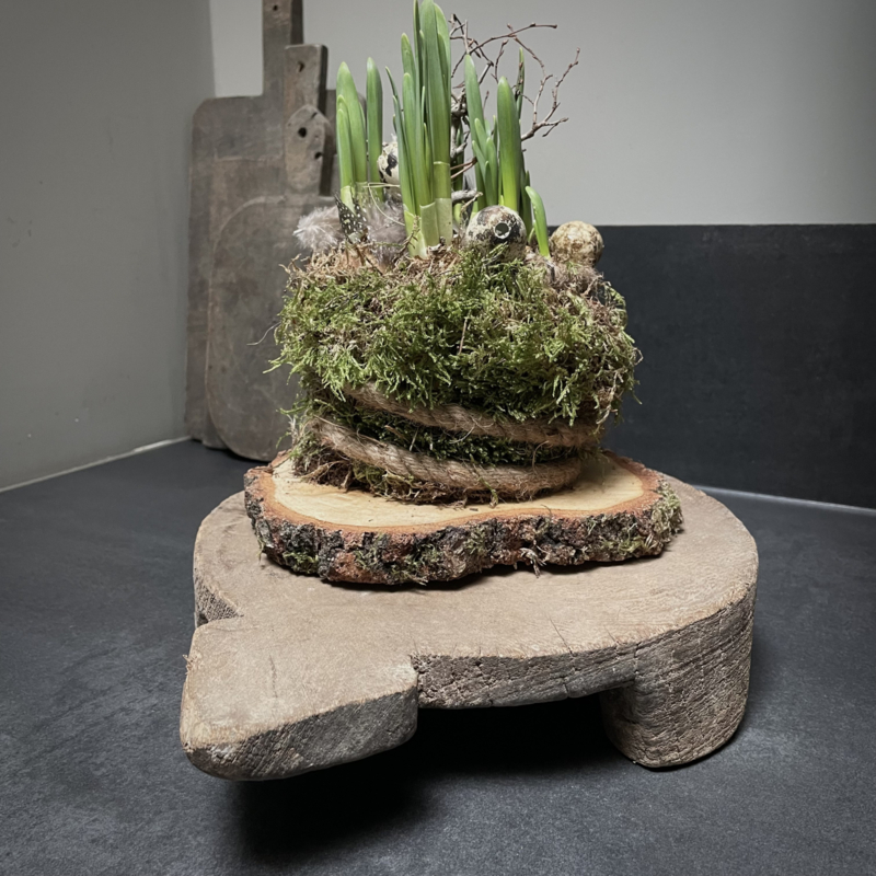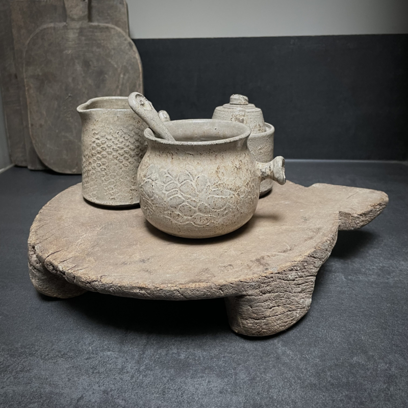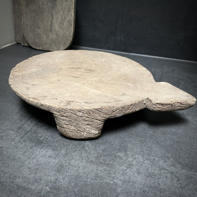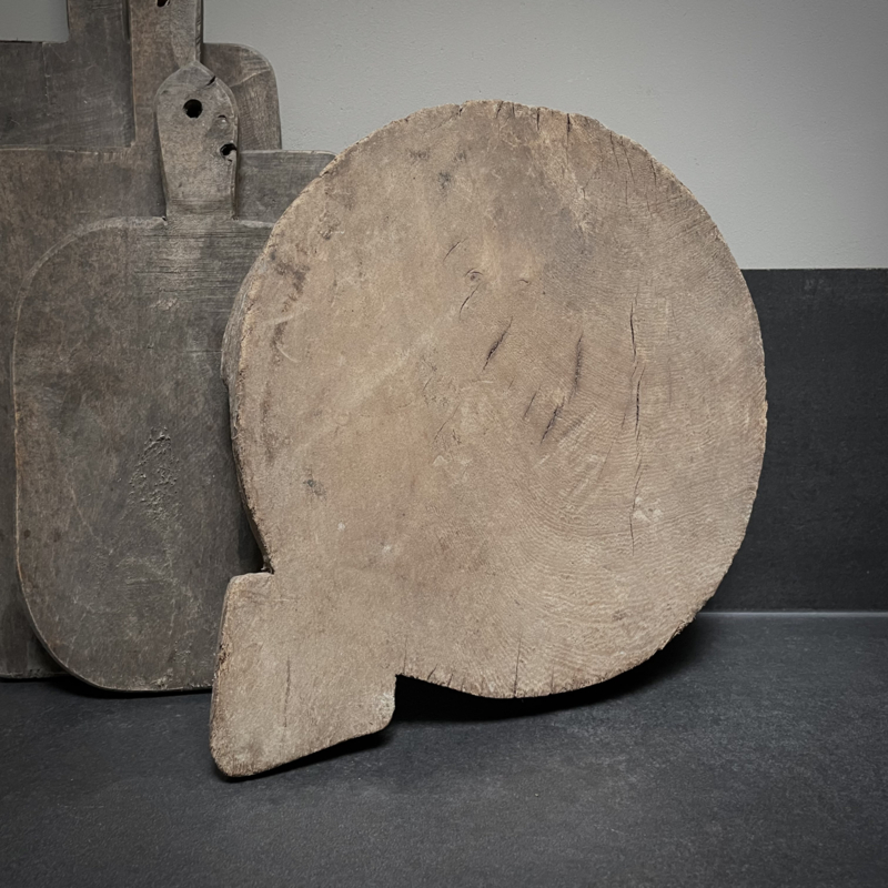 Oude verweerde Bajot plank. De lengte is 34 cm, de hoogte is 6 cm en de diameter is 26,5 cm.