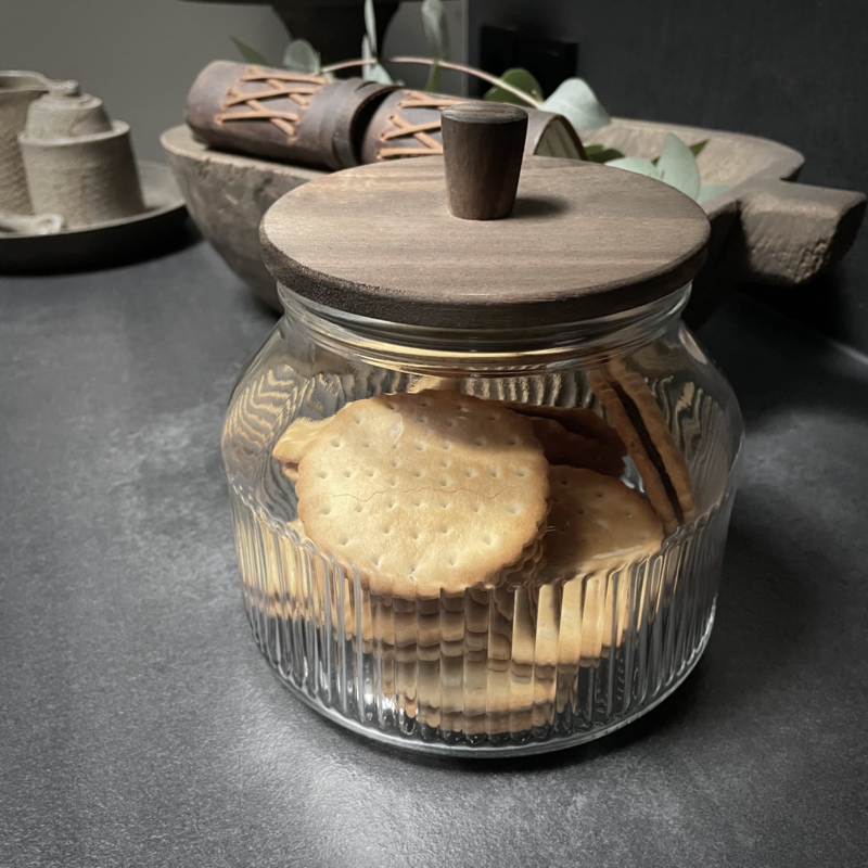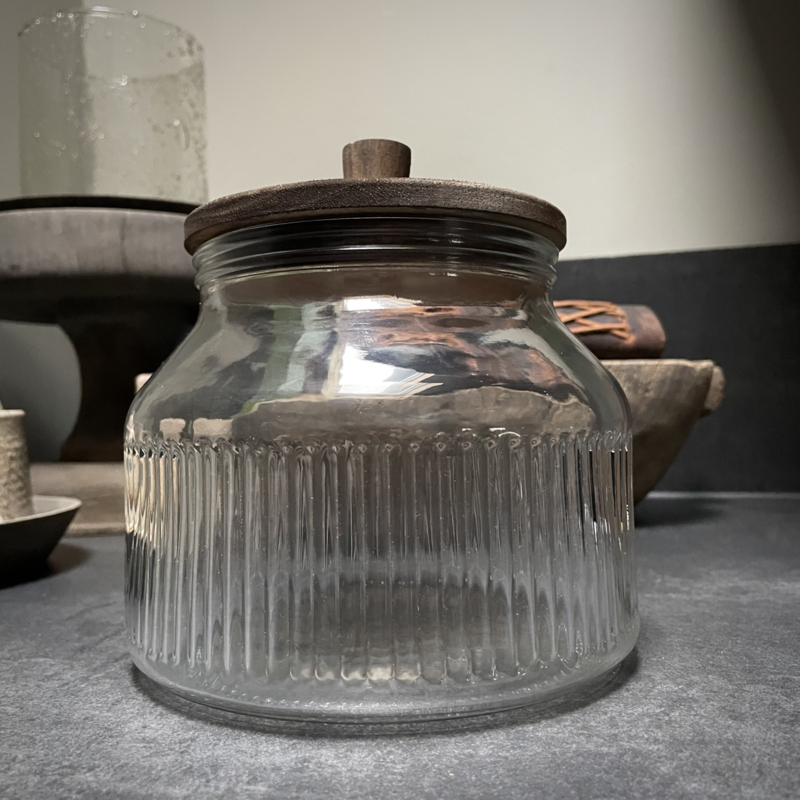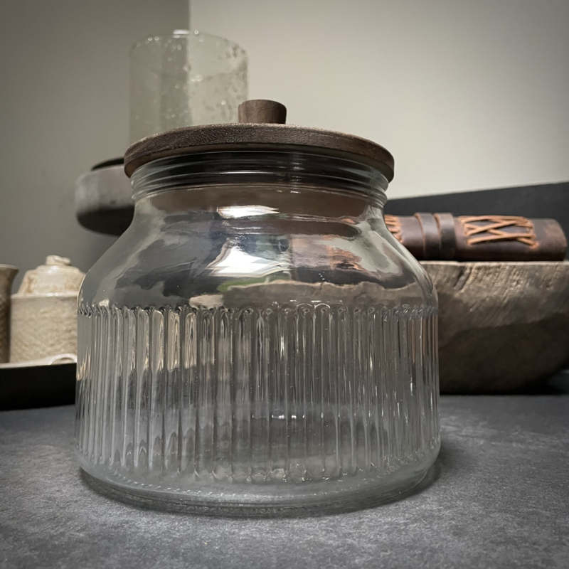Zware voorraadpot met houten deksel en geribbeld glas. Breng sfeer en functionaliteit in je keuken met deze stijlvolle voorraadpot. De combinatie van het robuuste geribbelde glas en de warme houten deksel zorgt voor een tijdloze en natuurlijke uitstraling. Ideaal voor het bewaren van koekjes, koffiebonen, pasta, snoep of noten. Door de rubberen ring in het deksel blift de inhoud goed afgesloten. Een praktische en decoratieve toevoeging aan je keuken. De hoogte is 16 cm, ook de diameter is 16 cm.