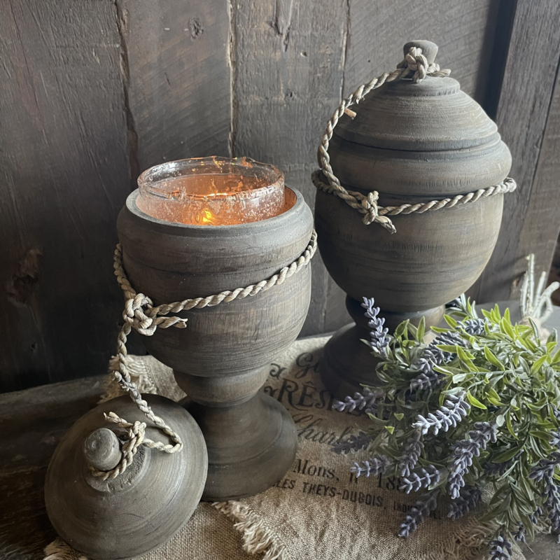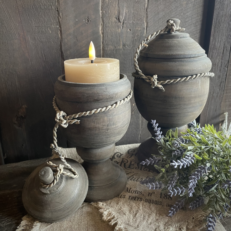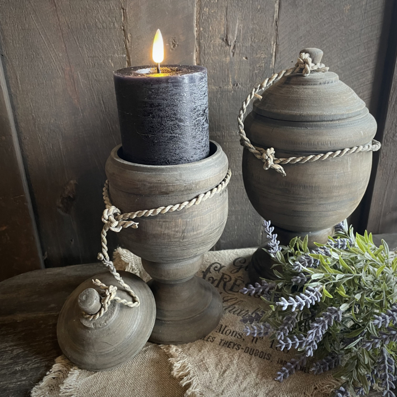 Houten pot op voet met deksel 'nieuw'. Ook ideaal om als voorraadpot te gebruiken, bijvoorbeeld met koffiebonen/ cups, suikerklontjes of om theelichtjes in te bewaren. De hoogte is 22,5 cm. En de diameter is 10,5 cm.