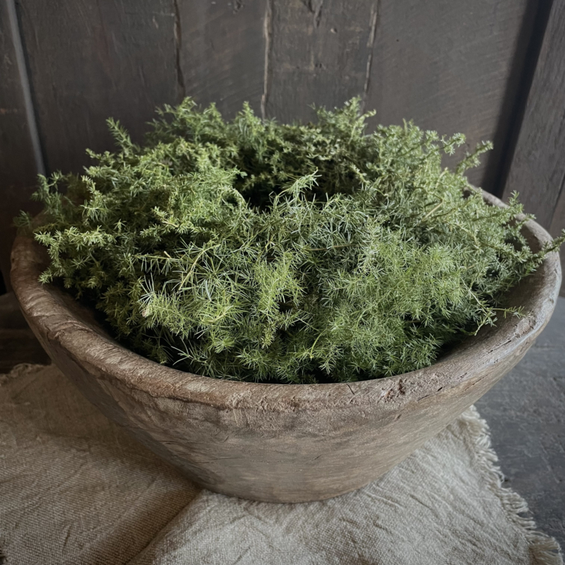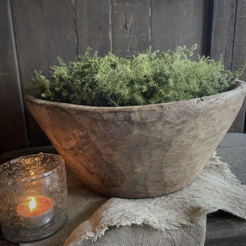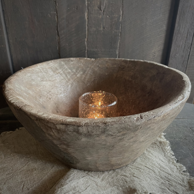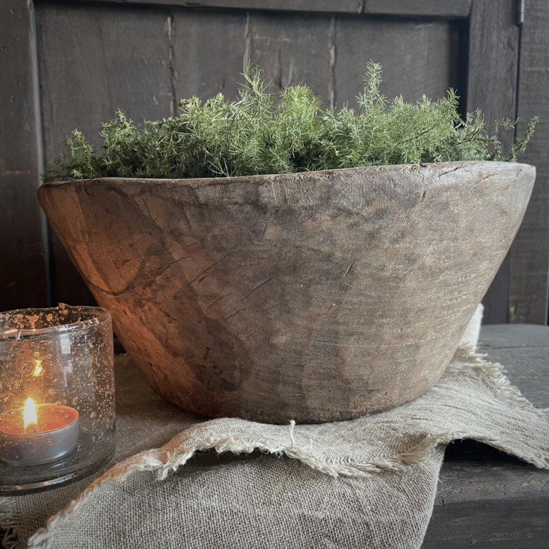 Deze oude houten vijzel is een echte blikvanger met zijn prachtig verweerde uitstraling en robuuste gewicht. Het doorleefde hout geeft een uniek karakter en een warme landelijke sfeer. Op vele manieren te stylen, plaats er een windlicht in met wat groendecoratie, of vul de vijzel met walnoten, kwarteleitjes en een stukje linnen, of leg er een kransje op. Ook prachtig op het aanrecht gevuld met koffiebonen. De hoogte is 14,5 cm, de diameter is 34 cm.