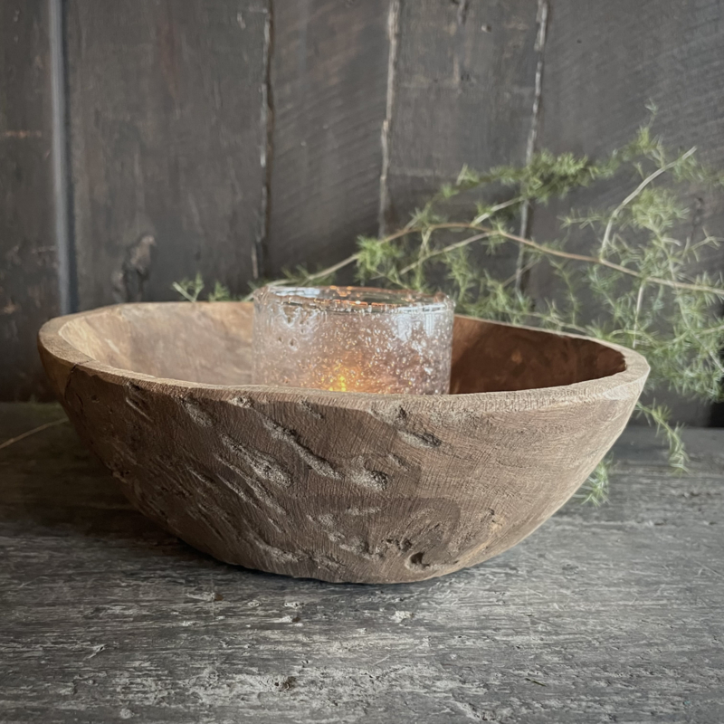 Oud houten schaaltje. Het doorleefde hout geeft een uniek karakter en een warme landelijke sfeer. Op vele manieren te stylen, plaats er een windlichtje in met wat groendecoratie, of vul de vijzel met walnoten, kwarteleitjes en een stukje linnen, of leg er een kransje op. Ook prachtig op het aanrecht gevuld met koffiebonen. De hoogte is 7,5 cm, de diameter is 22,5 cm.