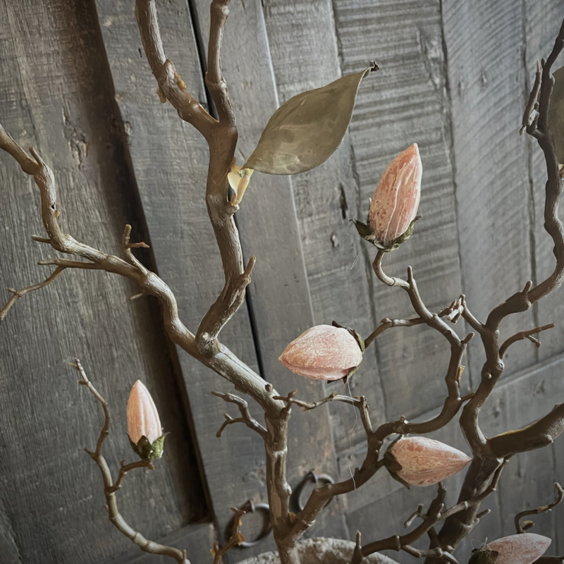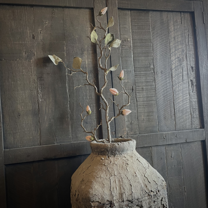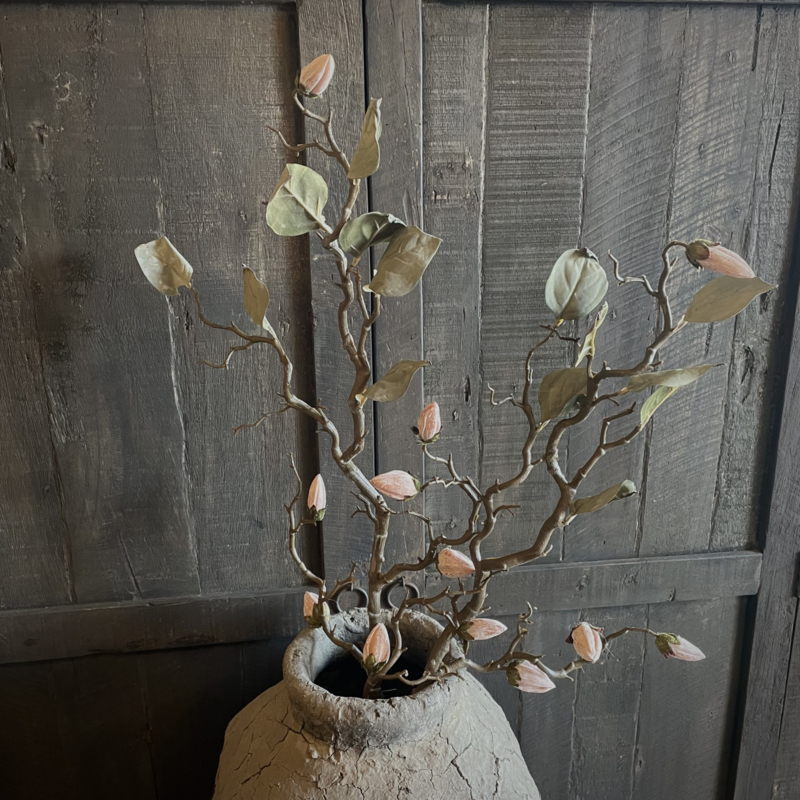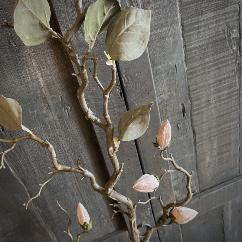 Prachtige zijde magnolia kunsttak in een mooie matte kleurstelling, met een bruine steel en 6 subtiele bloemknoppen in verschillende grootes. Deze tak heeft een volle en luxe uitstraling en blijft het hele jaar door mooi. Perfect om los te stylen in een vaas of pot. De totale lengte is 100 cm.