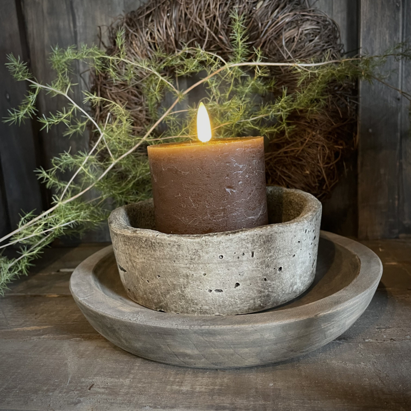 Stompkaars in de kleur chocolade bruin wax rustiek met 3D lont. De hoogte is 8 cm en de diameter is 7,5 cm.