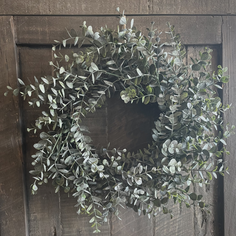 Eucalyptus 'kunst' krans in mooie matte vergrijsde kleurstelling, gebonden op een salimkrans. Deze krans heeft een diameter van 38 cm. De binnenkant afmeting is 14 cm. Leuk om op te hangen, maar ook ideaal op een schaal met een stompkaars of windlicht voor een volle uitstraling.