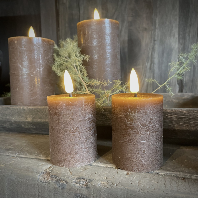 Set van 2 stompkaarsjes in de kleur chocolade bruin wax rustiek. Met 3D lont. De hoogte is 9,5 cm en de diameter is 5 cm. Warm white. Werkend op 2 AAA batterijen.