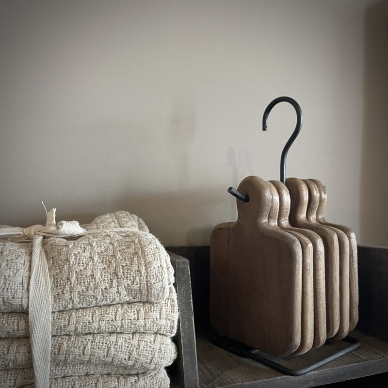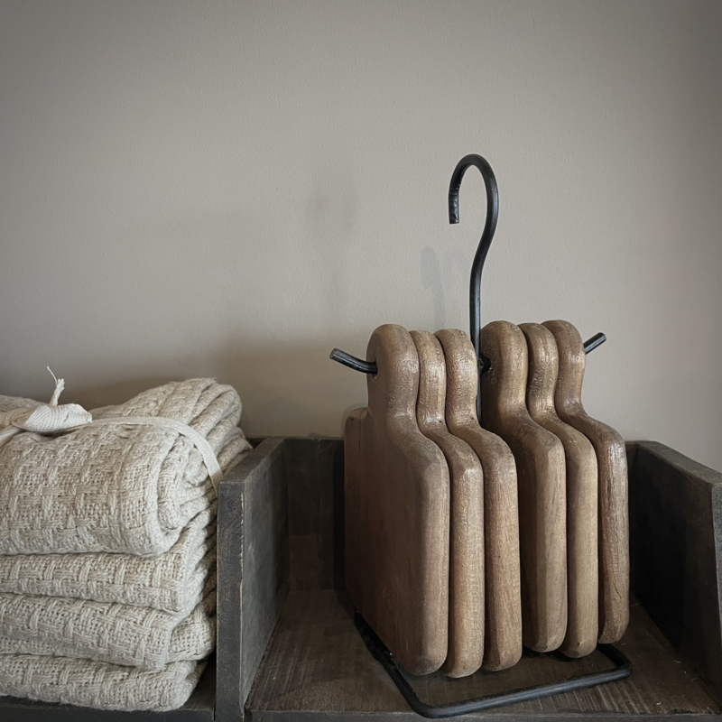 Set van 6 houten onderzetters aan metalen houder. De hoogte van de houder is 25 cm. de afmetingen van de onderzetters zijn: Lengte15 cm, diepte 10 cm.