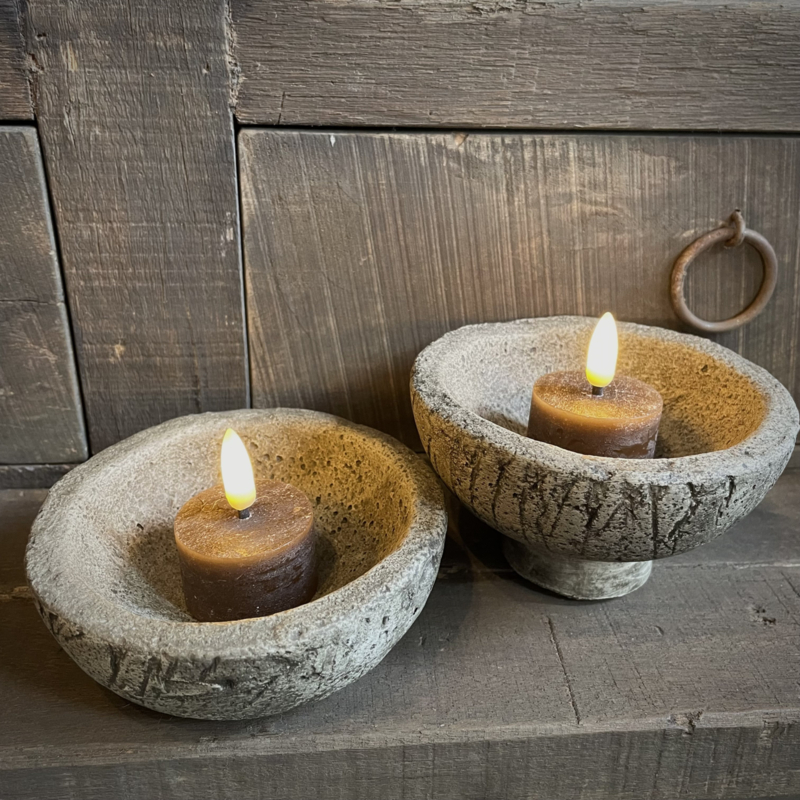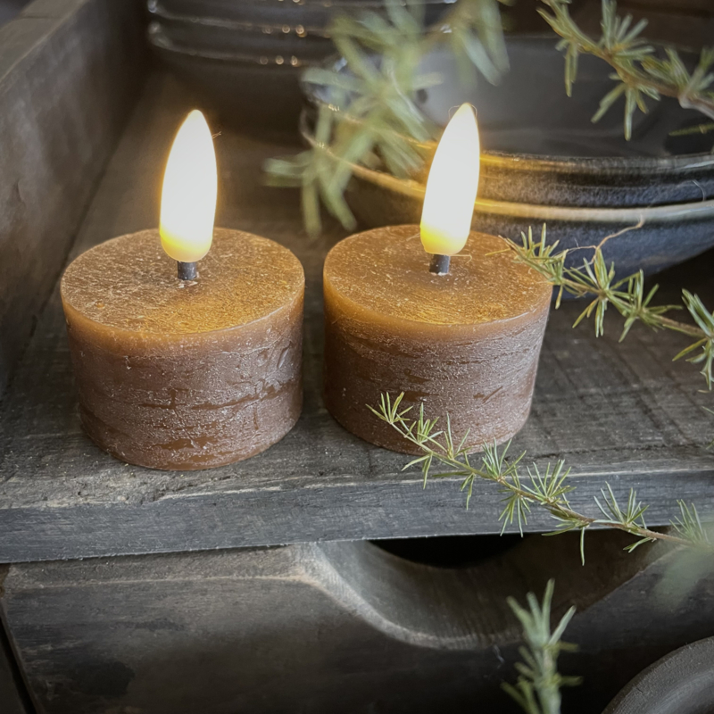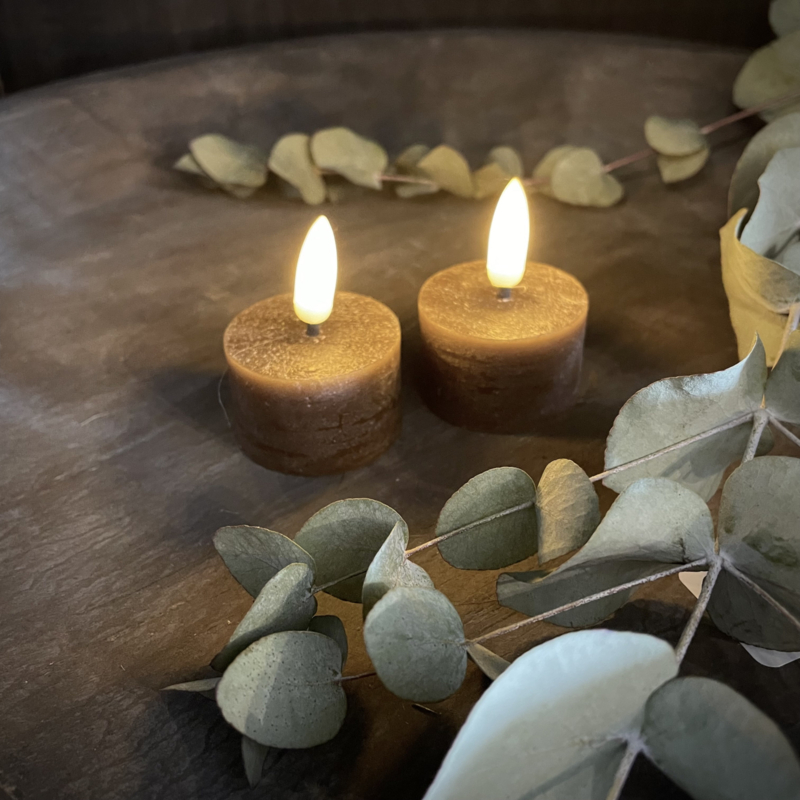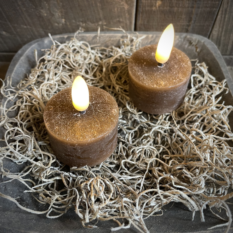 Set van 2 waxinelichtjes in de kleur chocolade wax rustiek. Met 3D lont. De hoogte is 2,5 cm (excl vlam gemeten) en de diameter is 3,8 cm. Warm white.