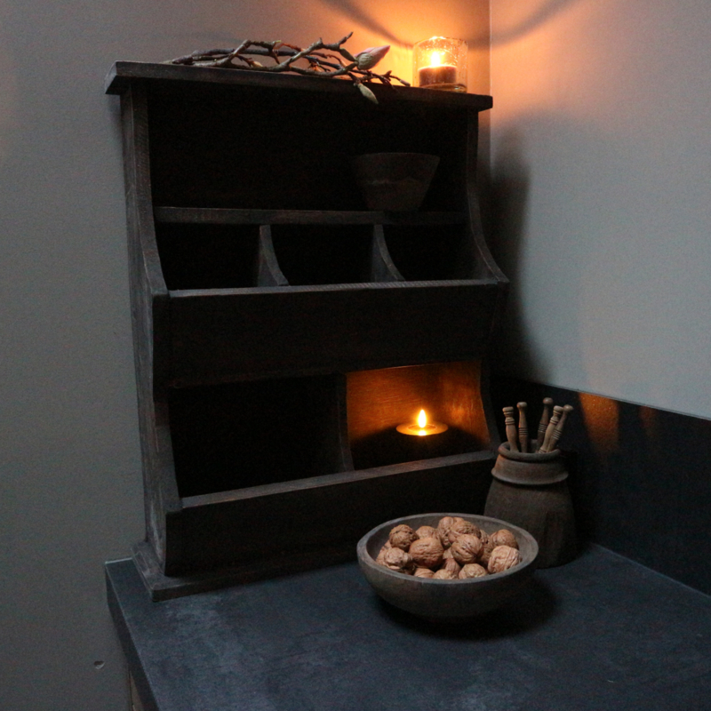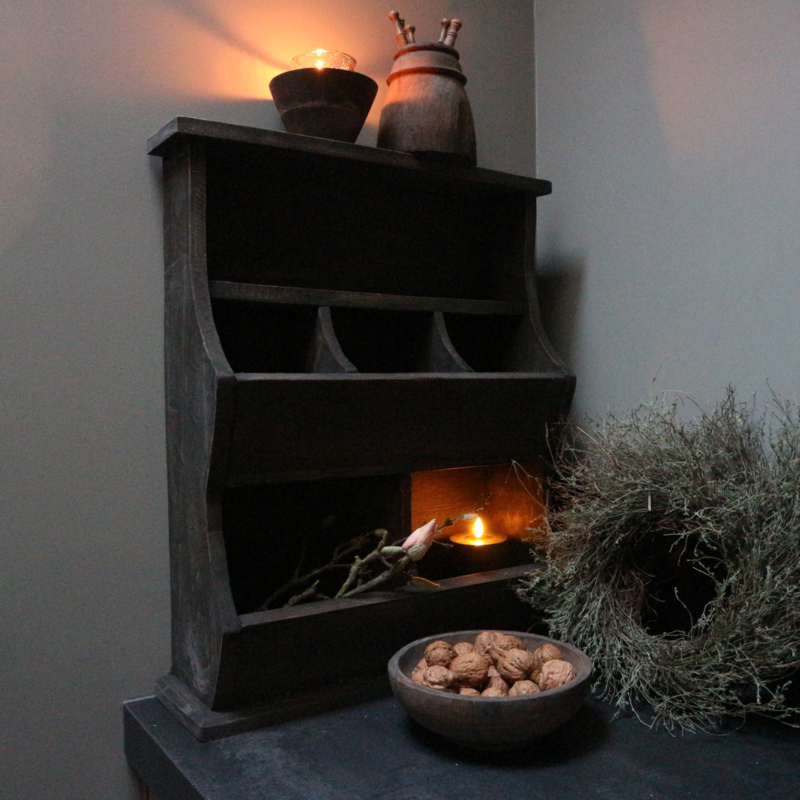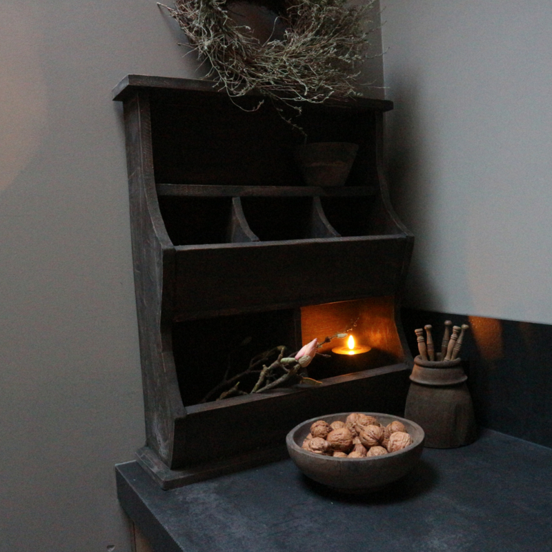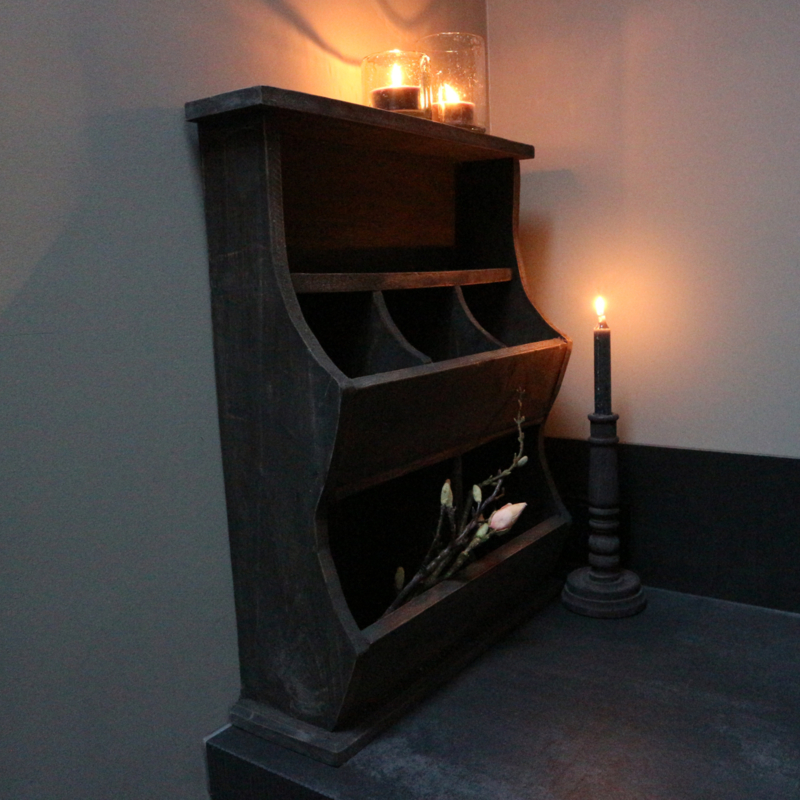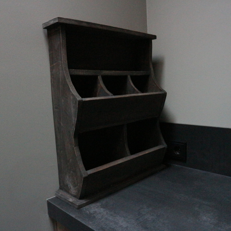 Grijs verweerde gruttersbak. De breedte is 49,5 cm, de hoogte is 60 cm en de diepte is 15,5 cm.