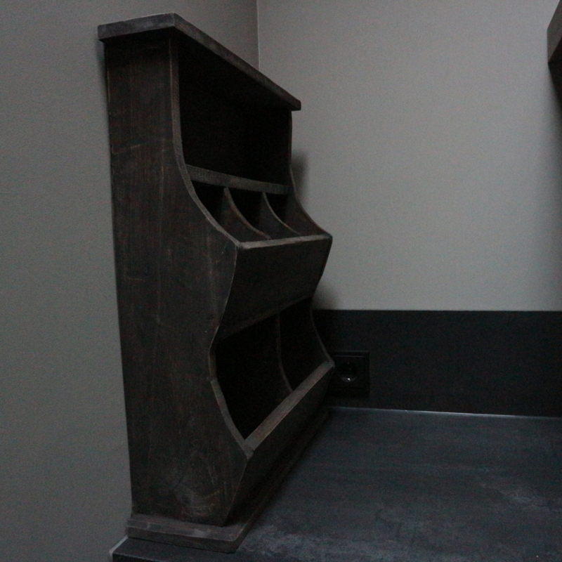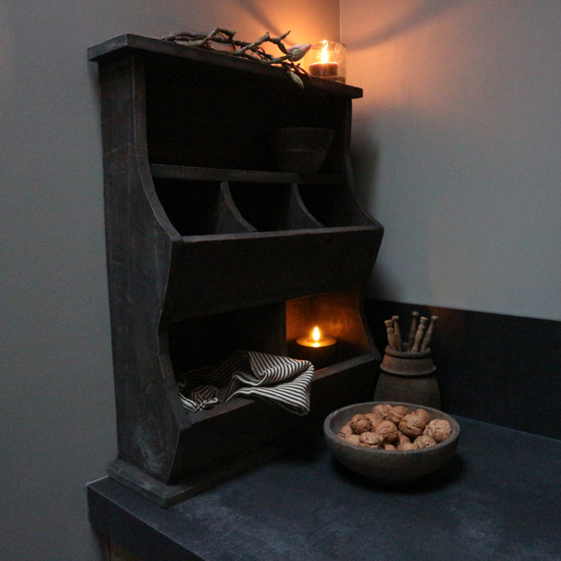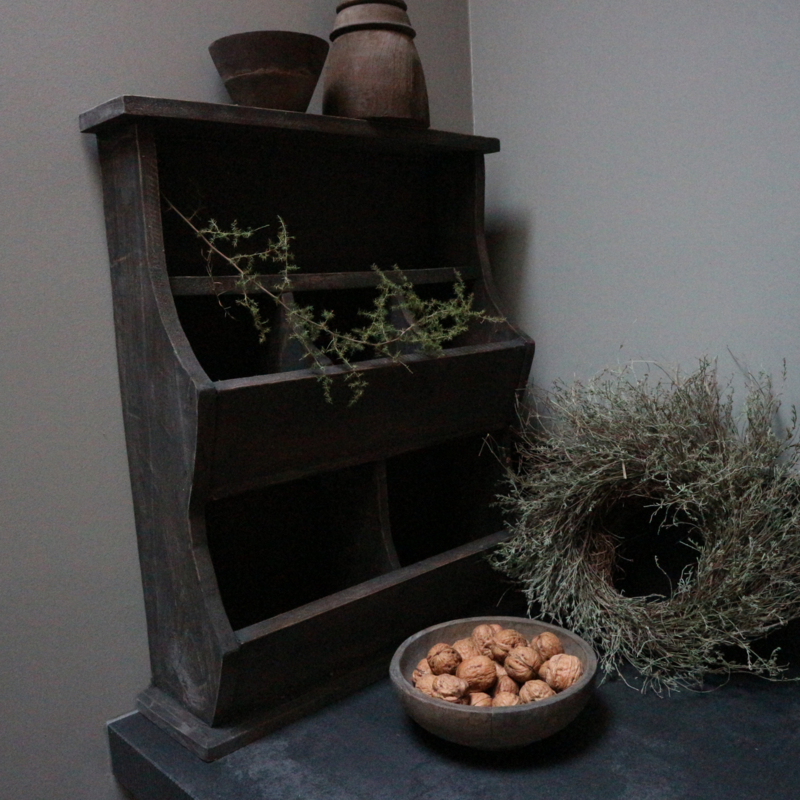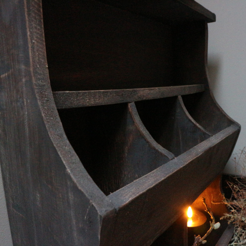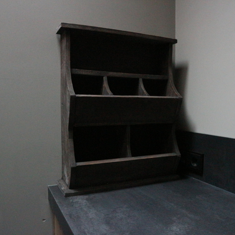 Grijs verweerde gruttersbak. De breedte is 49,5 cm, de hoogte is 60 cm en de diepte is 15,5 cm.
