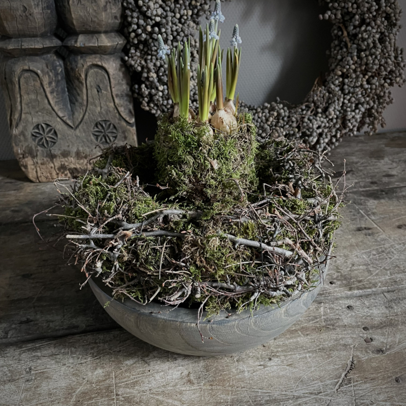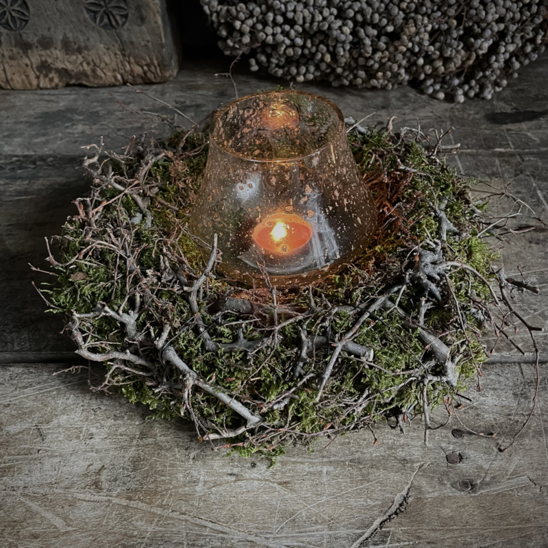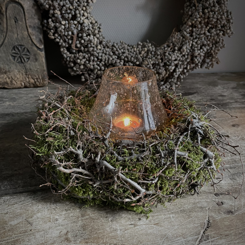 Nest van bonsaitakken en mos. De diameter is 30 cm. Mooi met een windlichtje, of te vullen met kwarteleieren. (ook bij ons verkrijgbaar.)