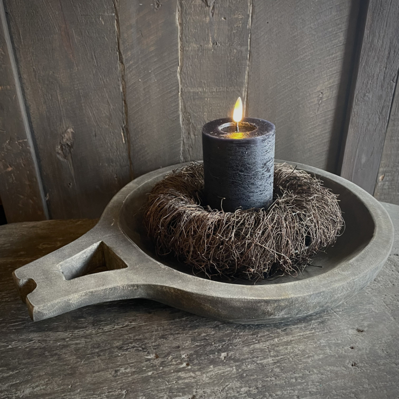 Vergrijsde houten schaal met greep ( L 38 cm.)Houten schaal met greep in een mooie matte donker vergrijsde kleur. Prachtig met kaarsjes en groendecoratie, ook leuk voor op het aanrecht met bijvoorbeeld kopjes, lepeltjes e.d. De afmetingen zijn: Lengte 38 cm, diameter 31 cm,…