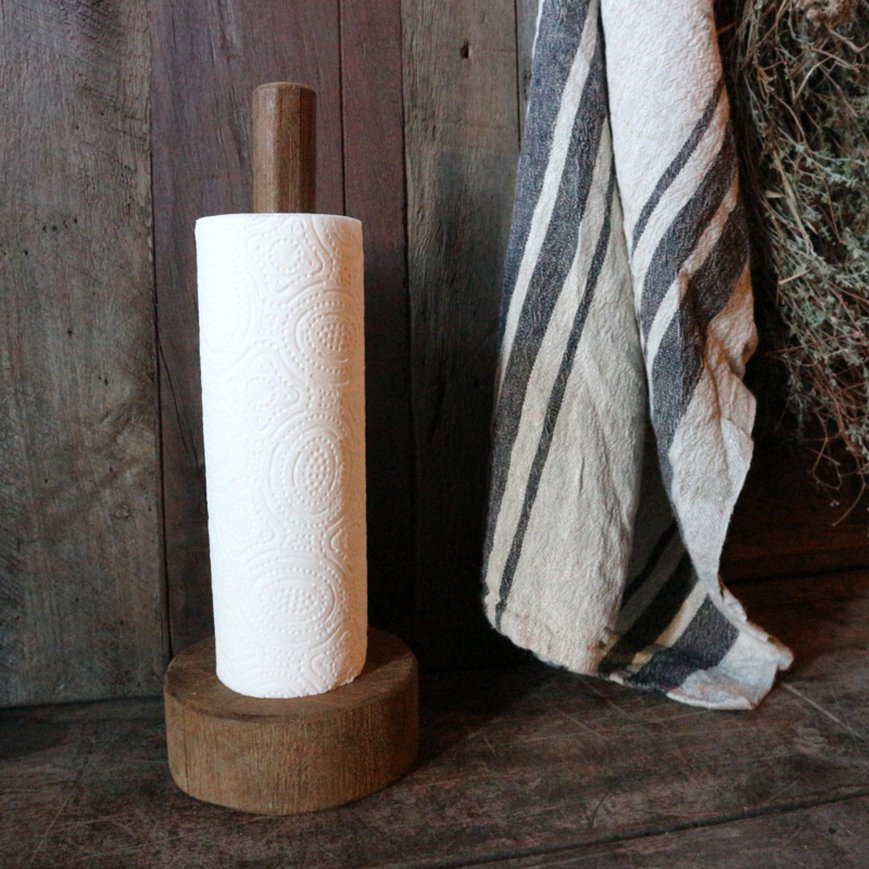 Houten keukenrolhouderStoere keukenrolhouder van oud hout. De hoogte is 34,5 cm en de diameter van de poot is 13 cm.
