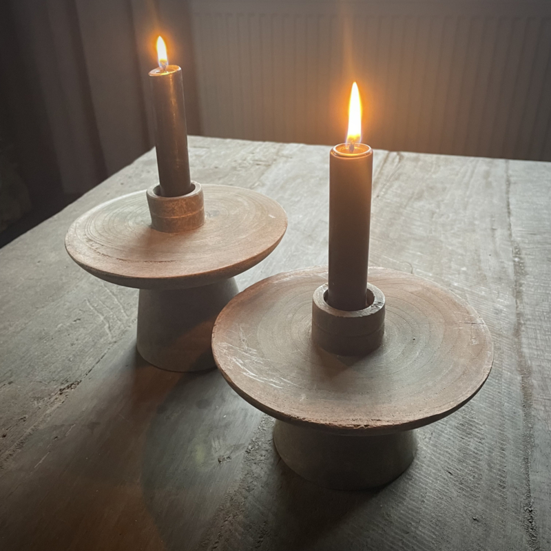 Houten kandelaar 'Bisa' Be Uniq L ( 12 cm.)Mooie vergrijsde houten kandelaar, van Be uniq type 'Bisa'. Prachtig in een landelijk interieur en veelzijdig neer te zetten, op de eettafel, in de vensterbank of op een dressoir. De hoogte is 12 cm, de diameter is 16.